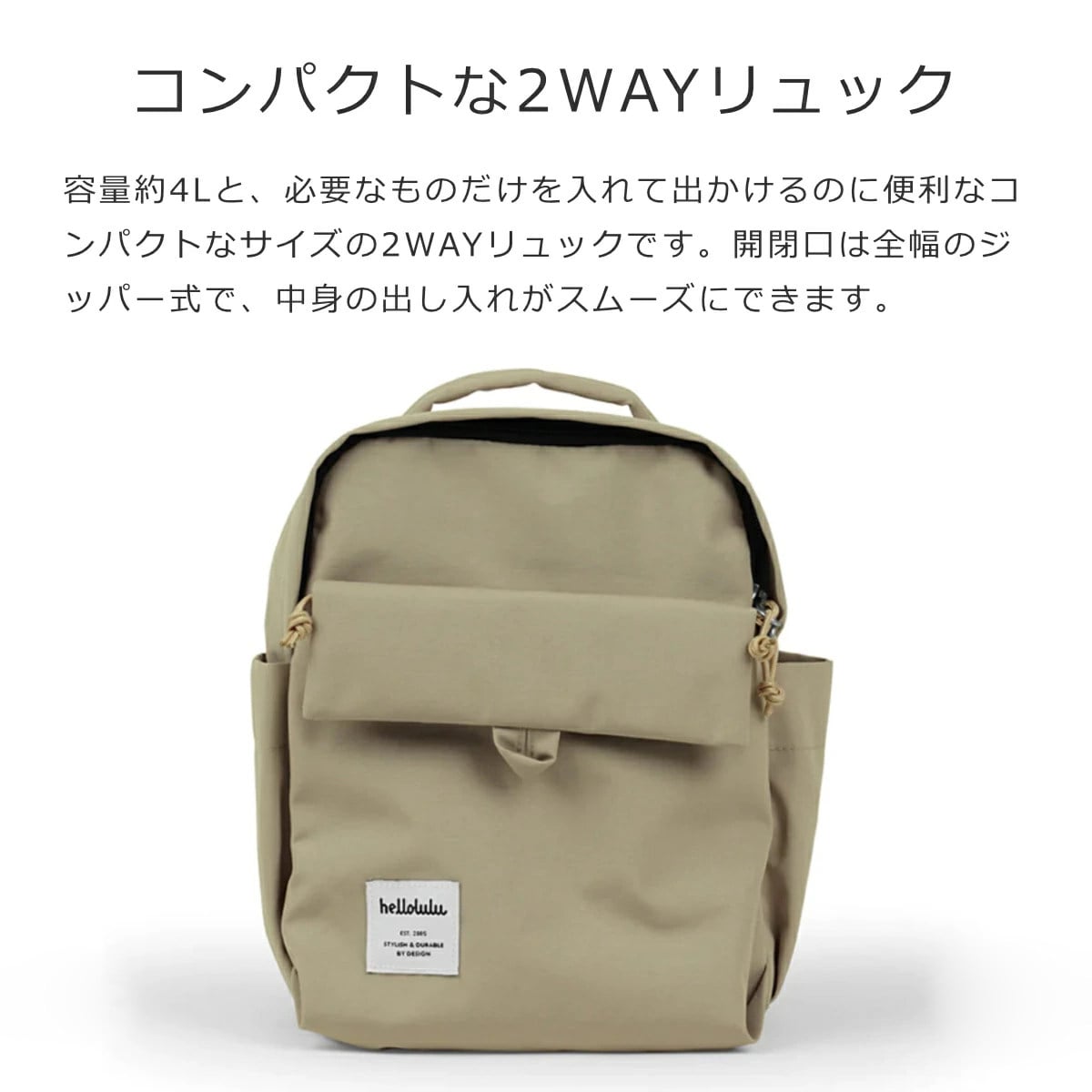 容量約4Lと、必要なものだけを入れて出かけるのに便利なサイズの2WAYリュックです。開閉口は全幅のジッパー式で大きく開き、中身の出し入れがスムーズにできます。