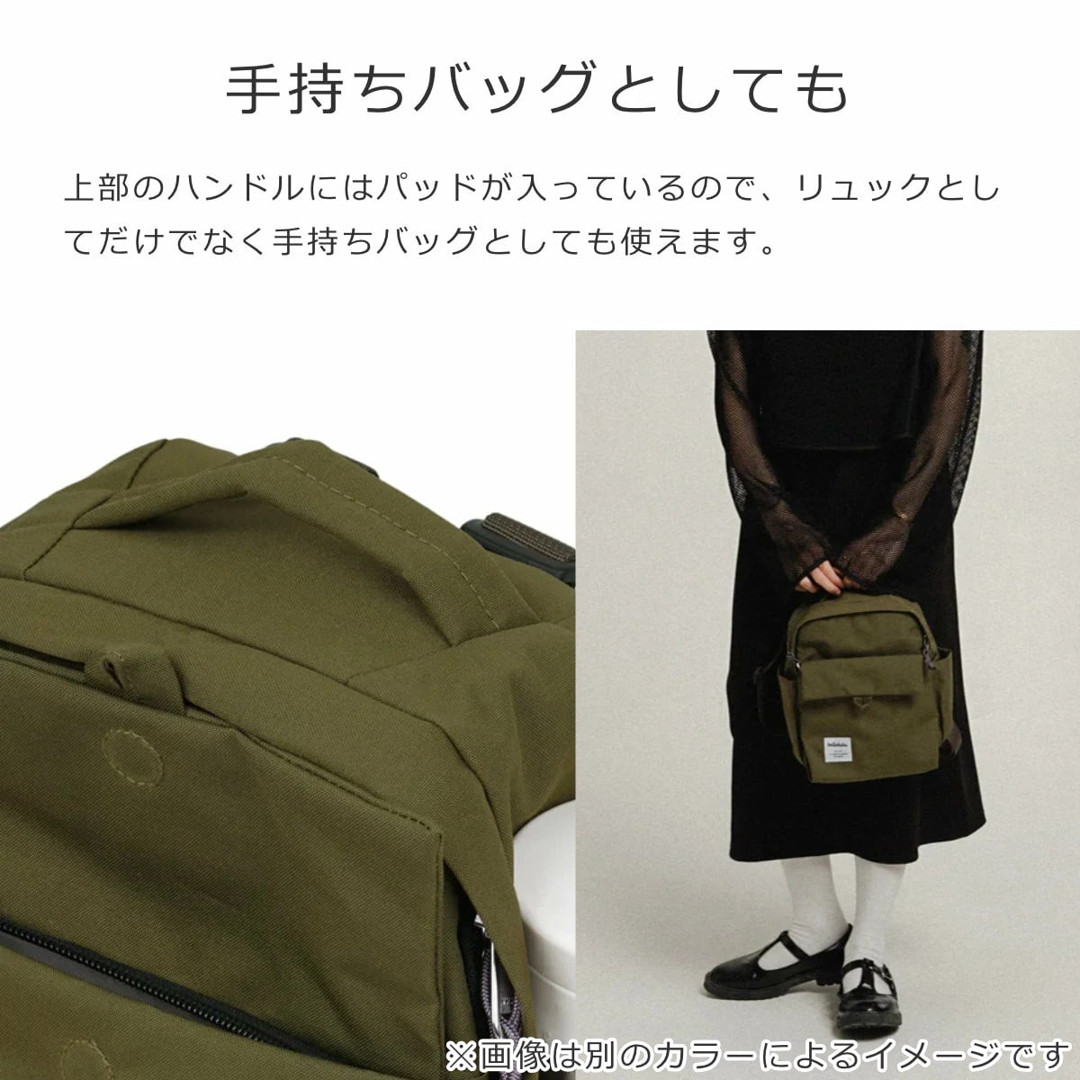 上部のハンドルにはパッドが入っているので、手持ちバッグとしても使えます。