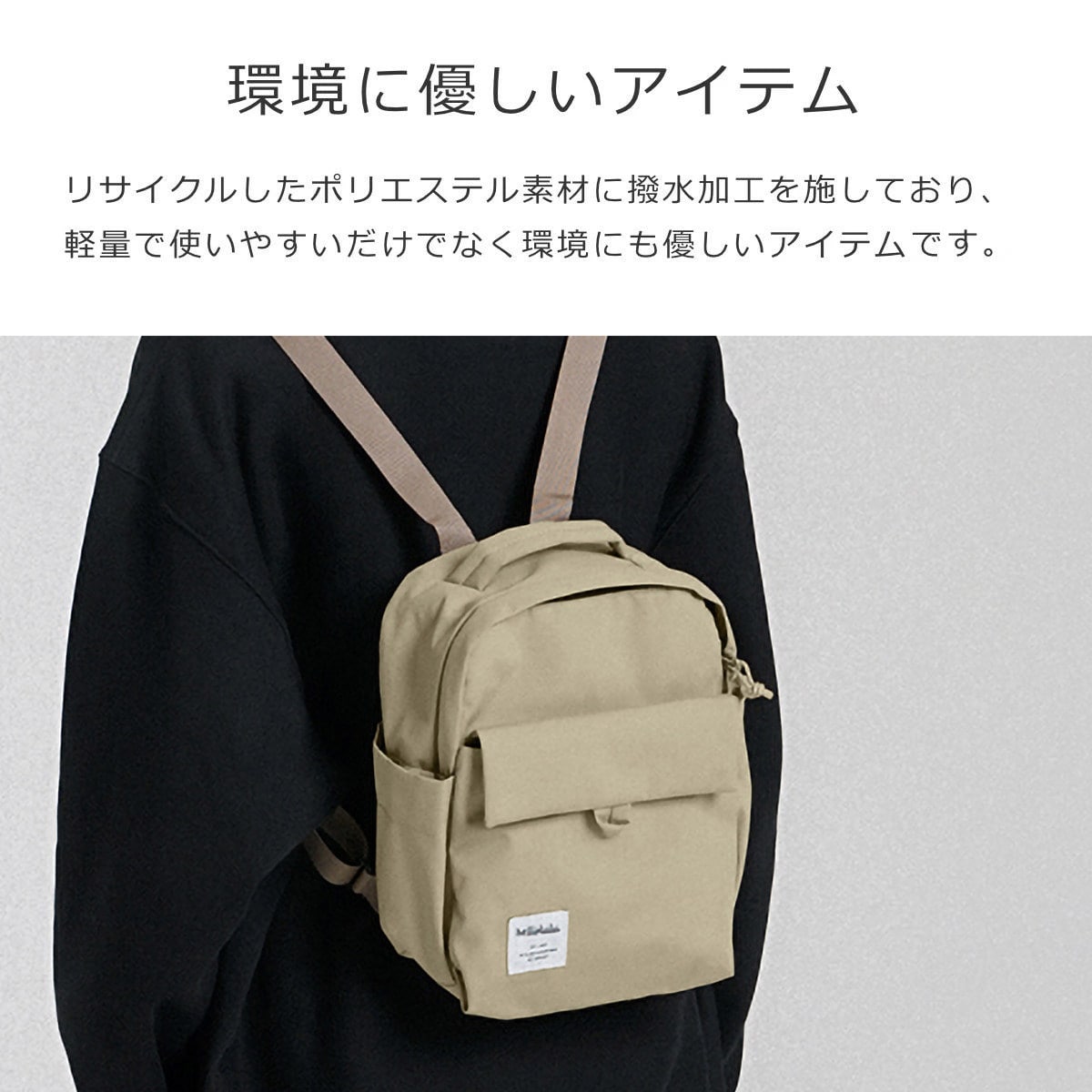 リサイクルしたポリエステル素材を使用しており、軽量で使いやすいだけでなく環境にも優しいアイテムです。撥水加工が施されているので、急な雨でも安心です。