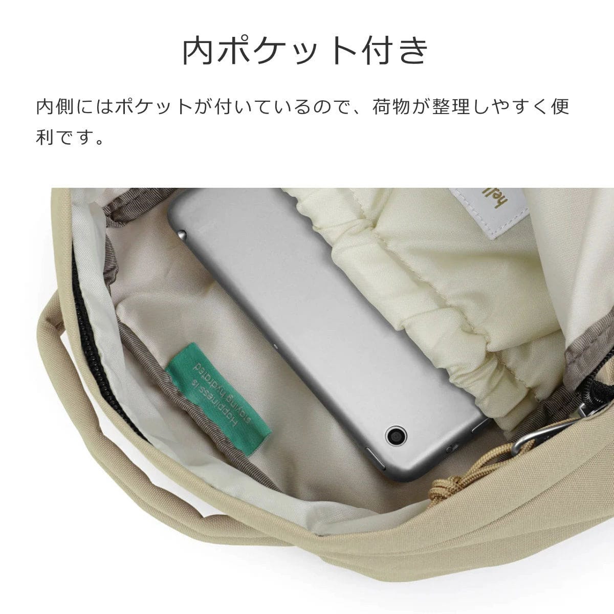 内側にはポケットが付いているので、荷物が整理しやすく便利です。