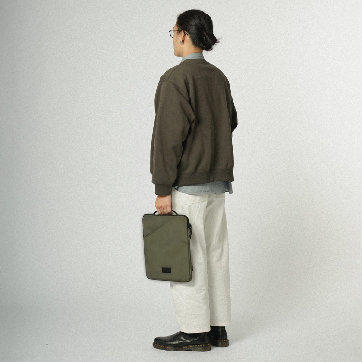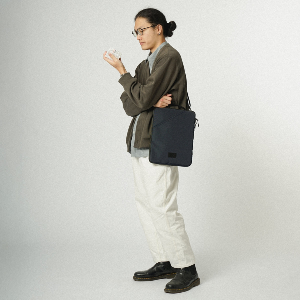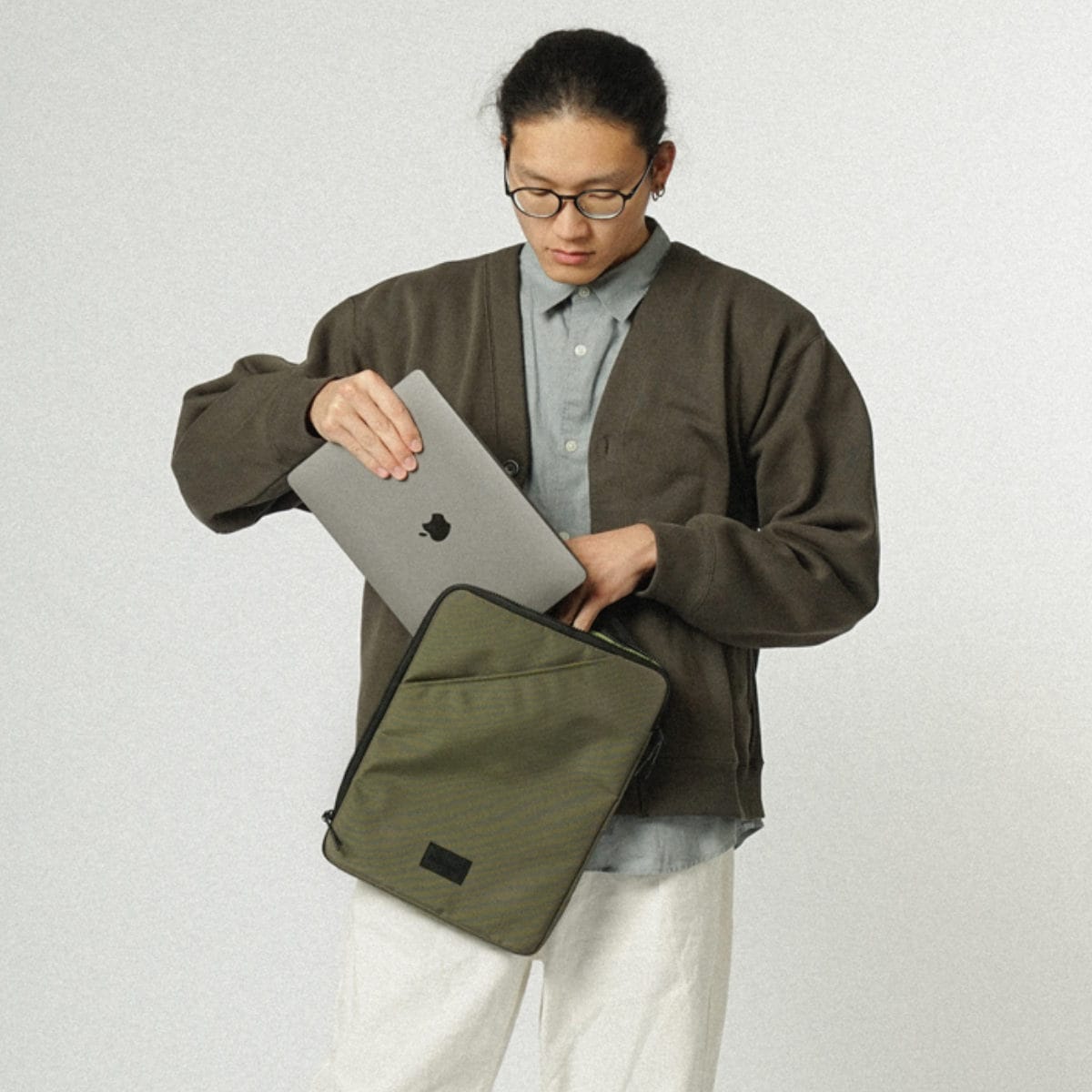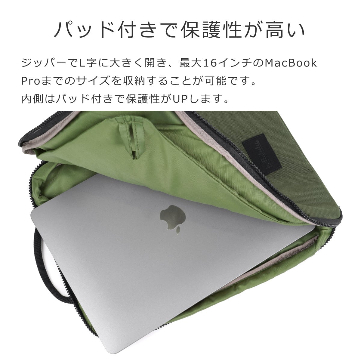 ジッパーでL字に大きく開き、最大16インチのMacBook Proまでのサイズを収納することが可能です。内側はパッド付きで保護性を高めます。