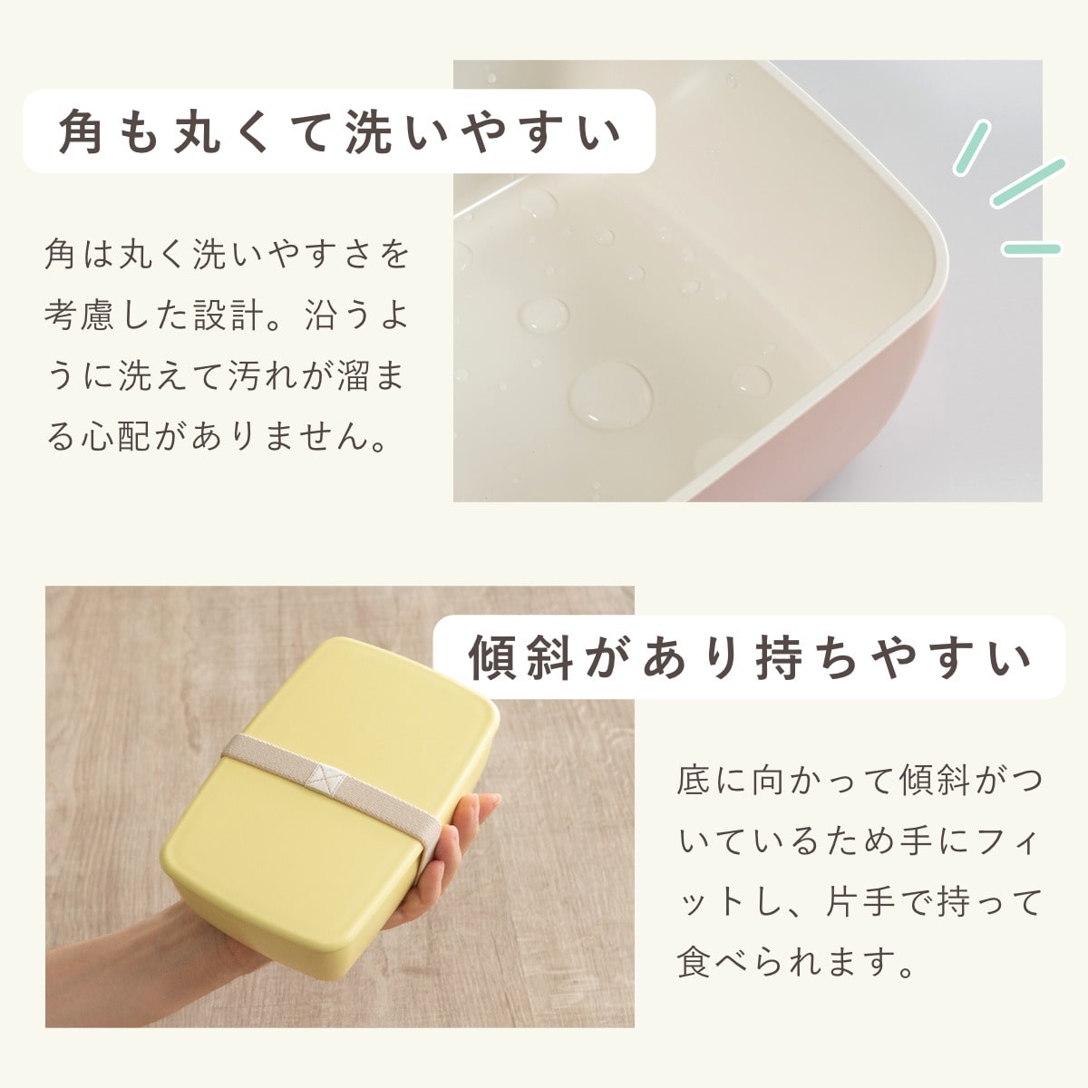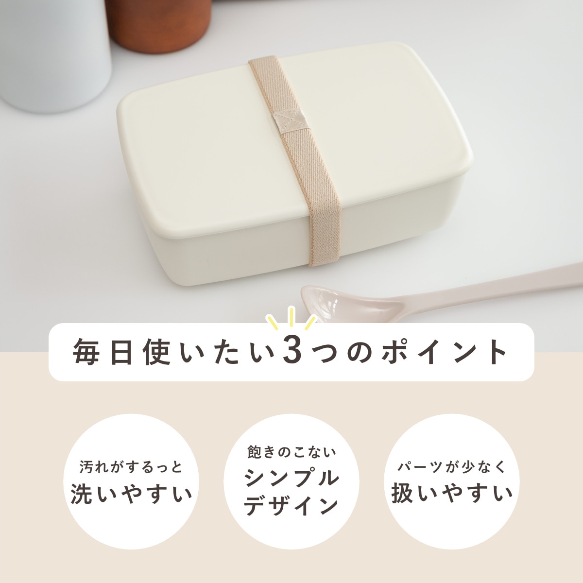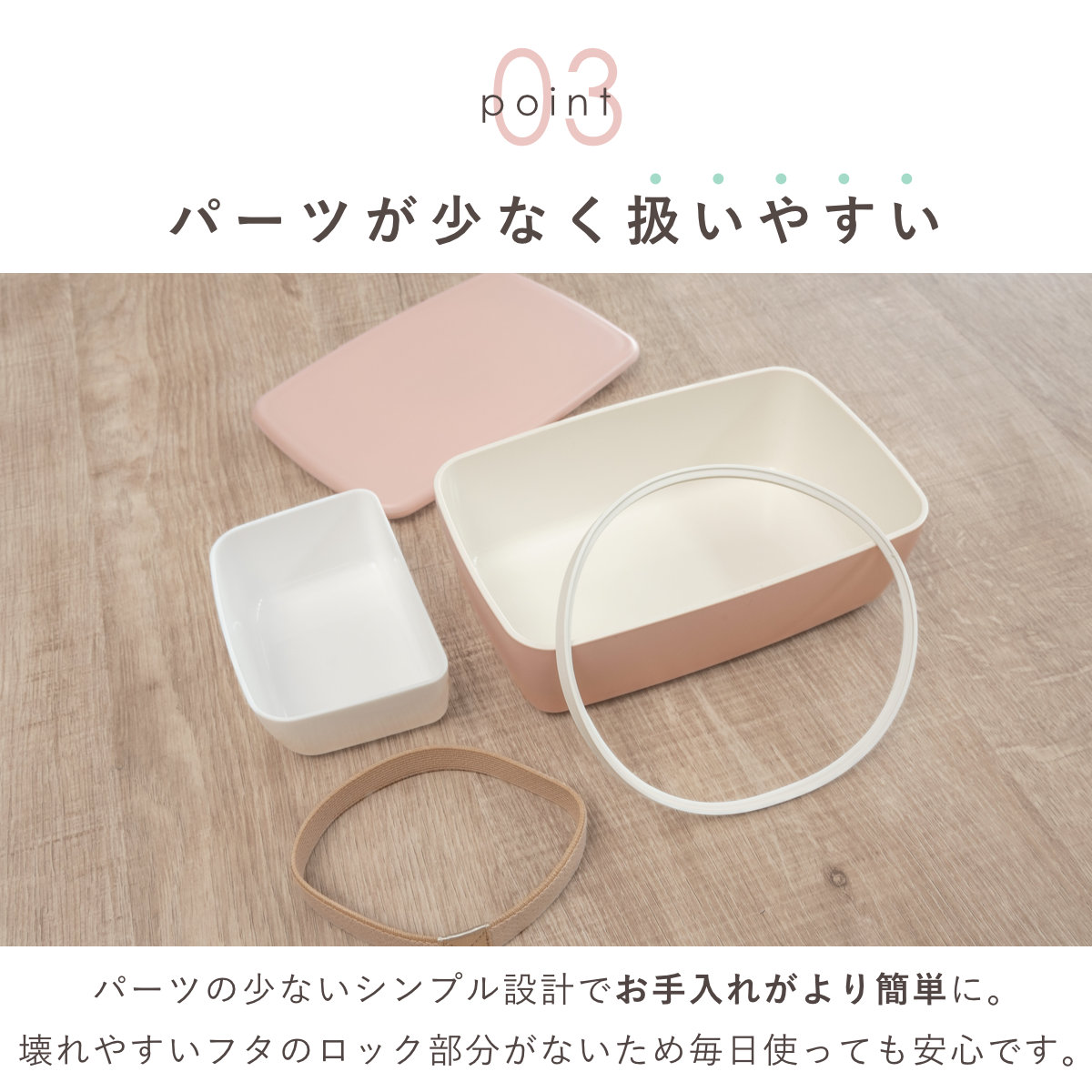 内蓋がなくパーツの少ないシンプル設計。パーツをなくす心配もなく、お手入れがより簡単に。壊れやすいフタのロック部分がないため、毎日使っても安心です。