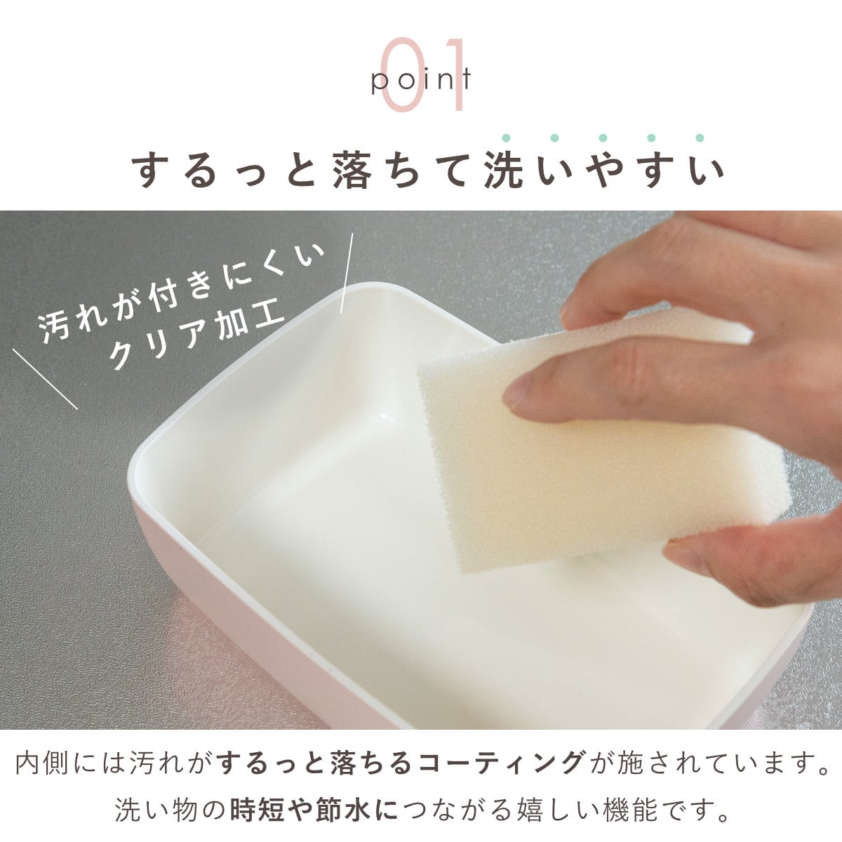 内側には汚れがつるんっと落ちるコーティングが施されています。毎日使うものだからこそ、ストレスの感じない使い心地にこだわりました。洗い物の時短や節水につながるうれしい機能です。