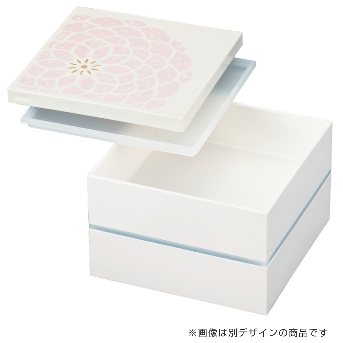 小ぶりで可愛らしい二段重です。白を基調とした本体に、ぱっと華が咲いたような可憐なデザインで、食卓を華やかに彩ります。