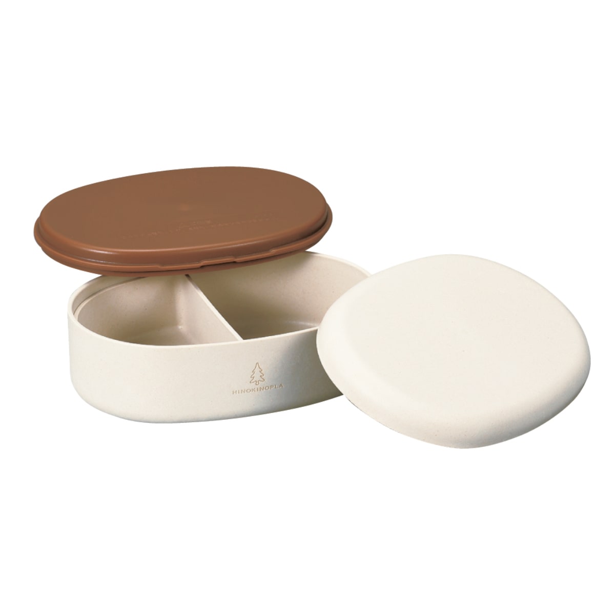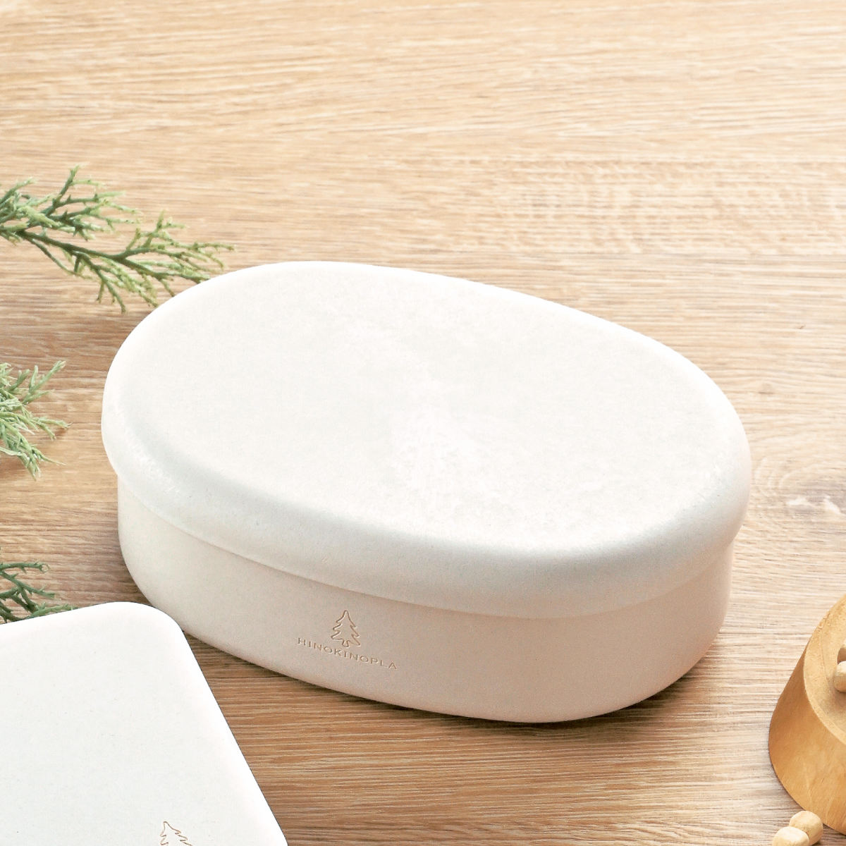 天然抗菌効果を持つヒノキの木粉を再利用しプラスチックと融合した「ひのきのぷら」で作られたお弁当箱です。ヒノキの木粉を使うことでプラスチックの使用量を50%に抑えています。中子が付いていて、ご飯とおかずを分けて入れることができます。一段式なので盛り付けも簡単です。
