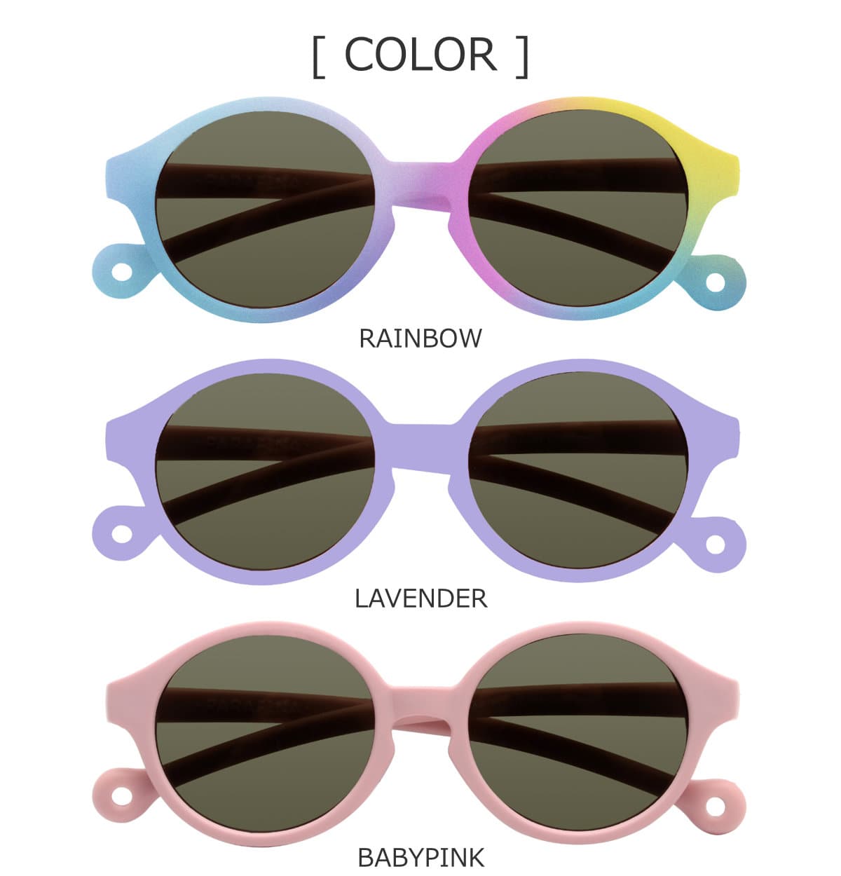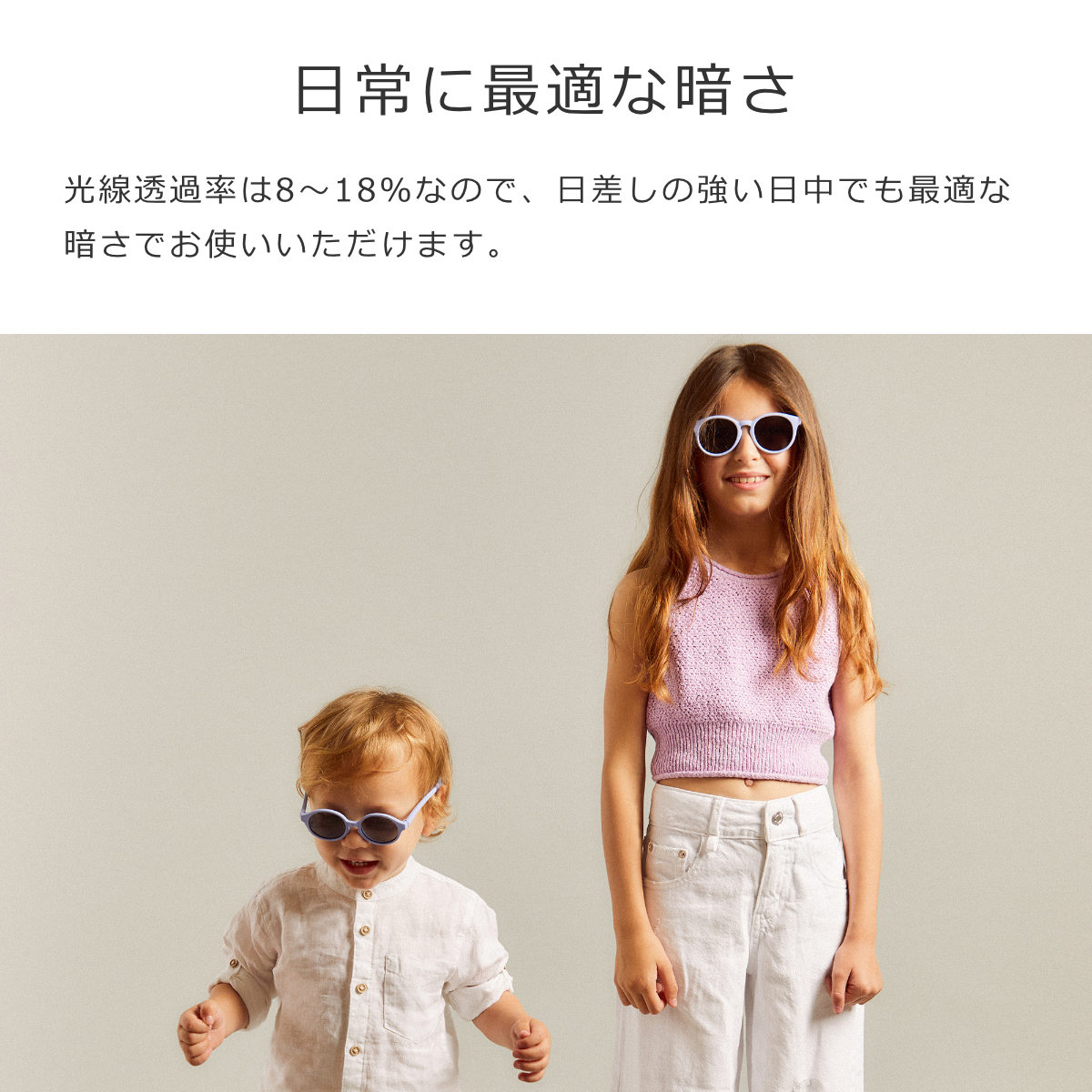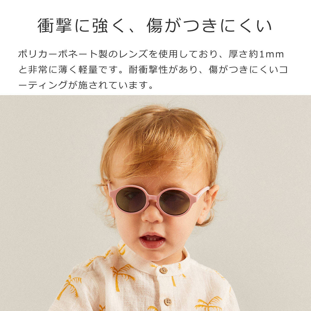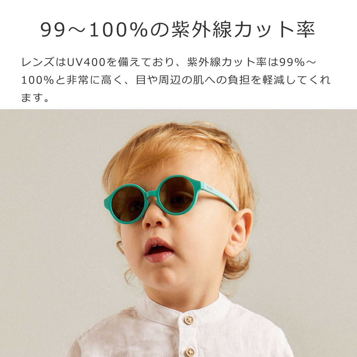 フレームにリサイクルされたタイヤゴムを使用した、環境に優しいキッズサイズのサングラスです。お子様の体型により異なるため目安サイズとなりますが、対象年齢は0才~2才となっています。