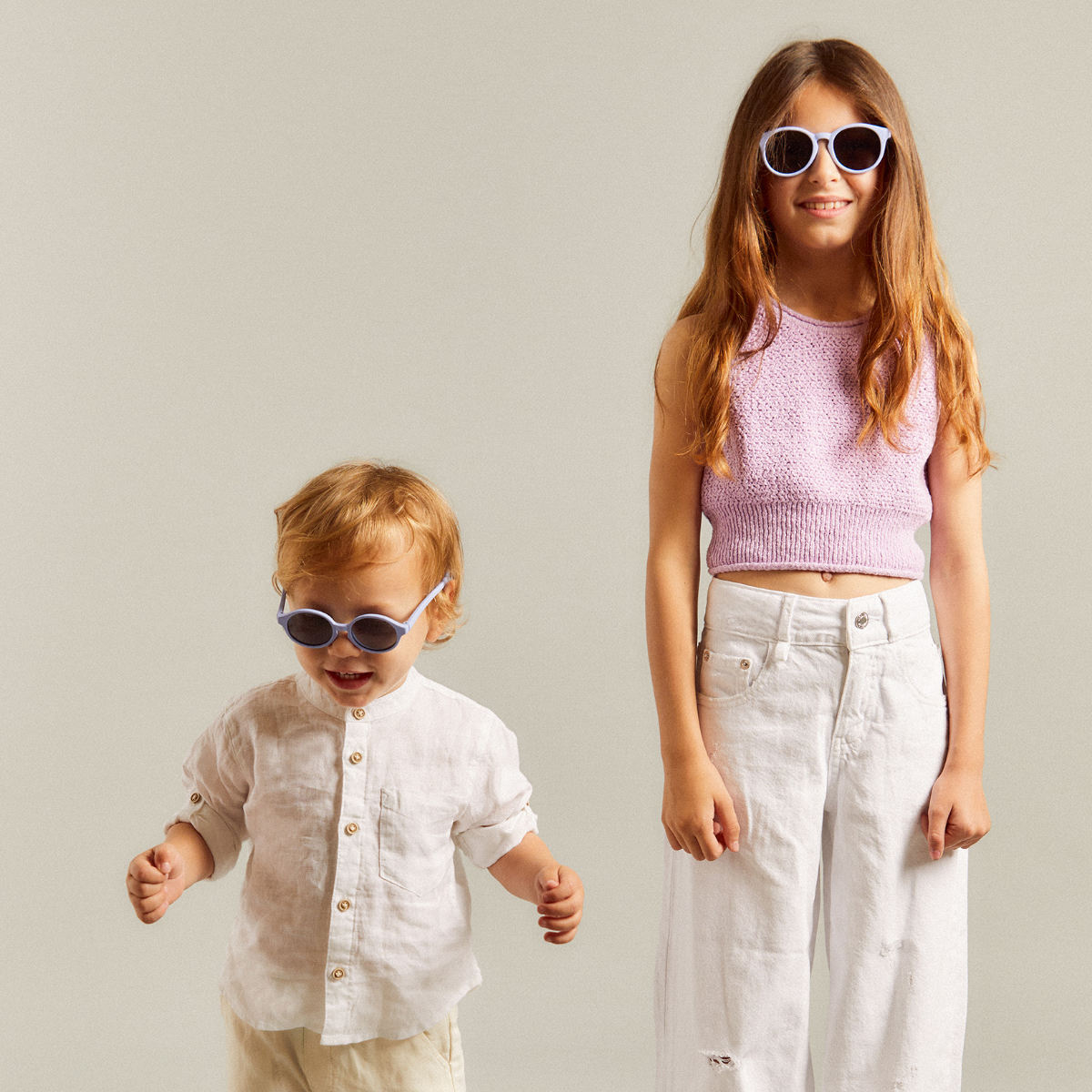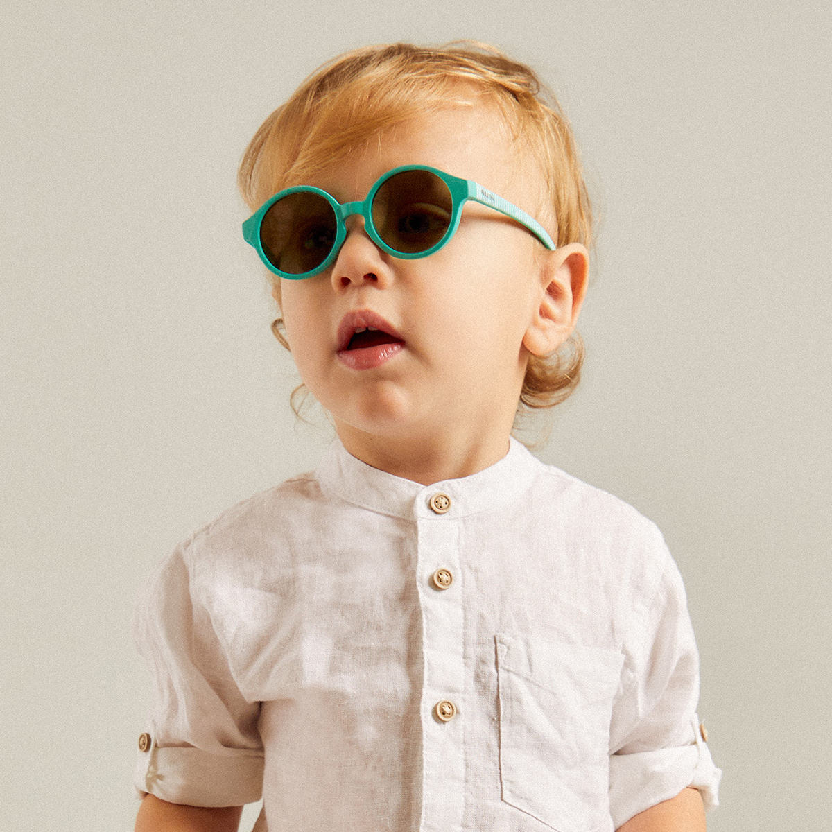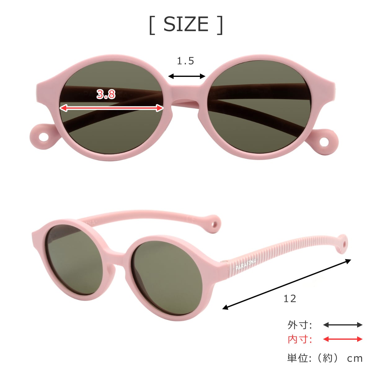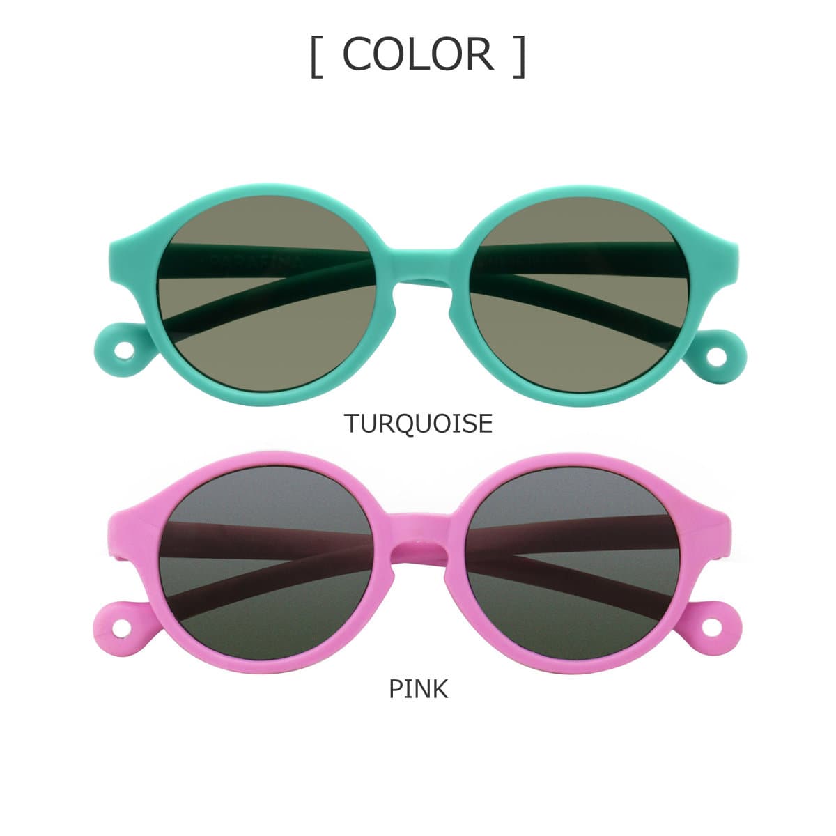 フレームにリサイクルされたタイヤゴムを使用した、環境に優しいキッズサイズのサングラスです。お子様の体型により異なるため目安サイズとなりますが、対象年齢は0才~2才となっています。