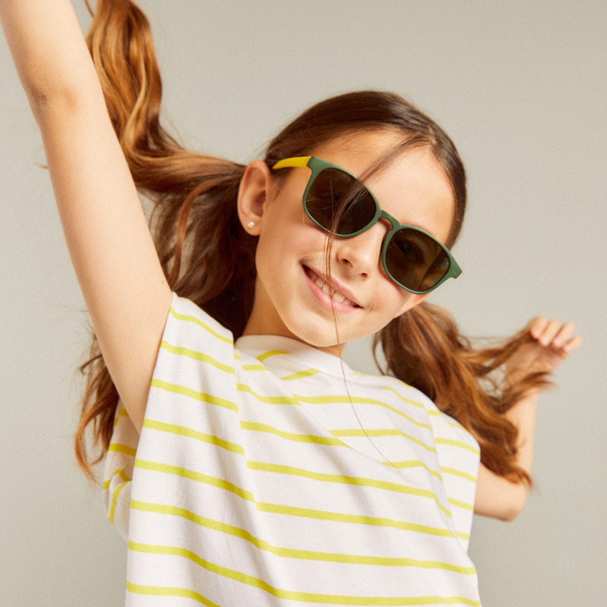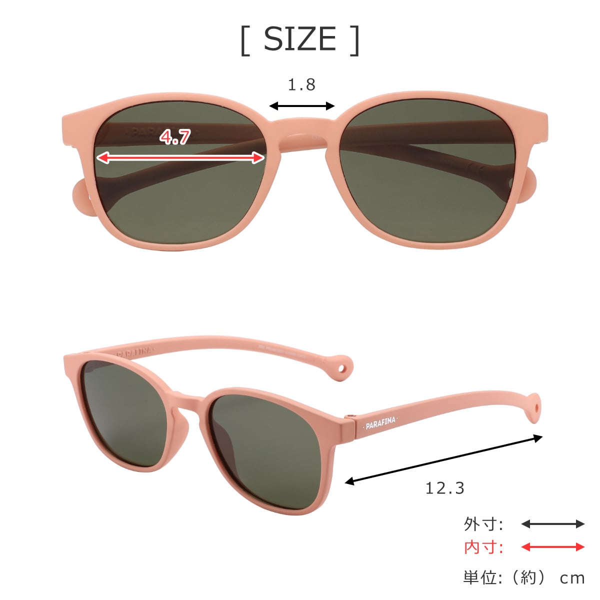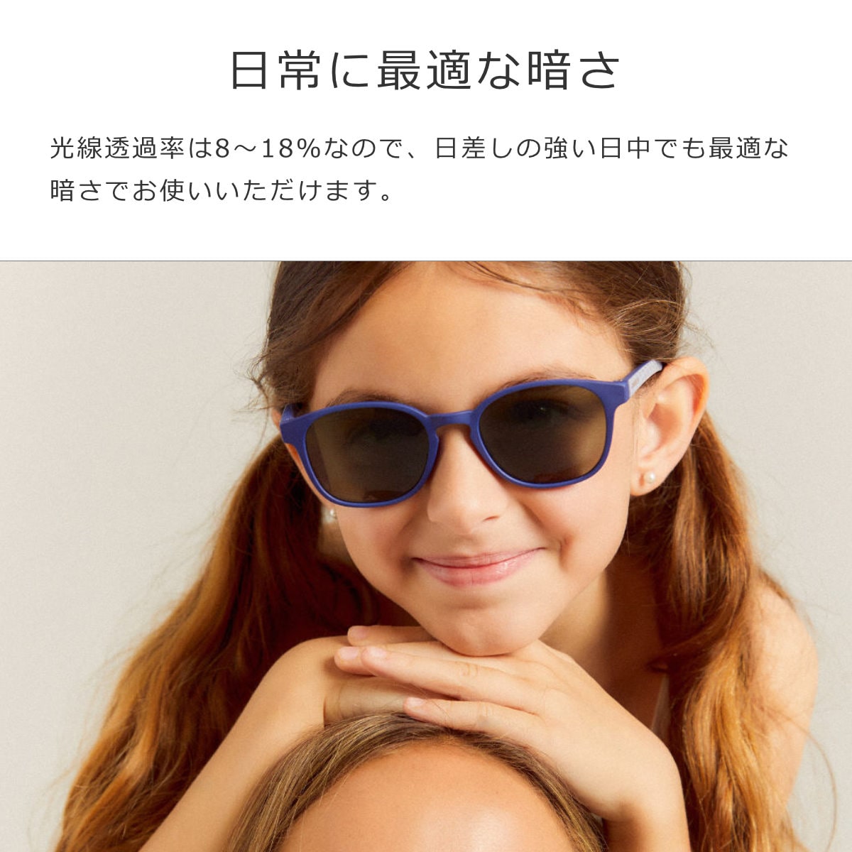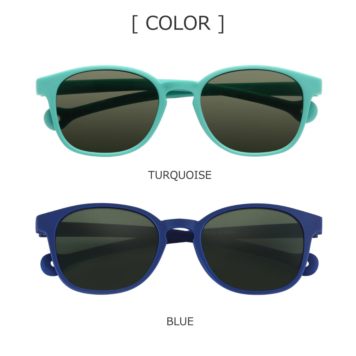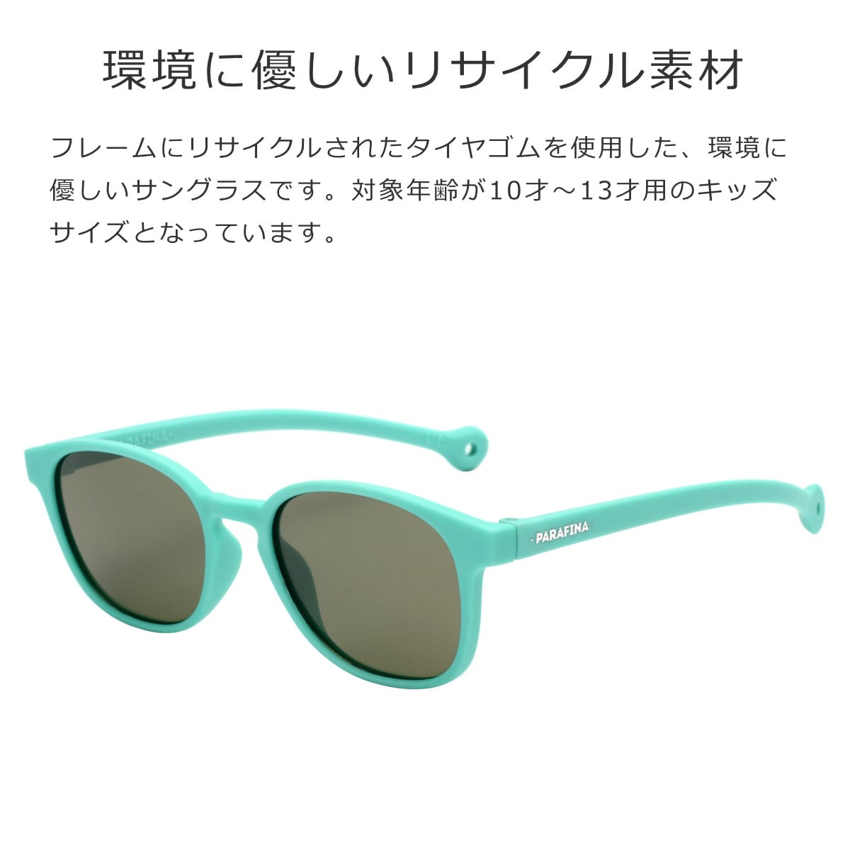 フレームにリサイクルされたタイヤゴムを使用した、環境に優しいキッズサイズのサングラスです。お子様の体型により異なるため目安サイズとなりますが、対象年齢は10才~13才となっています。