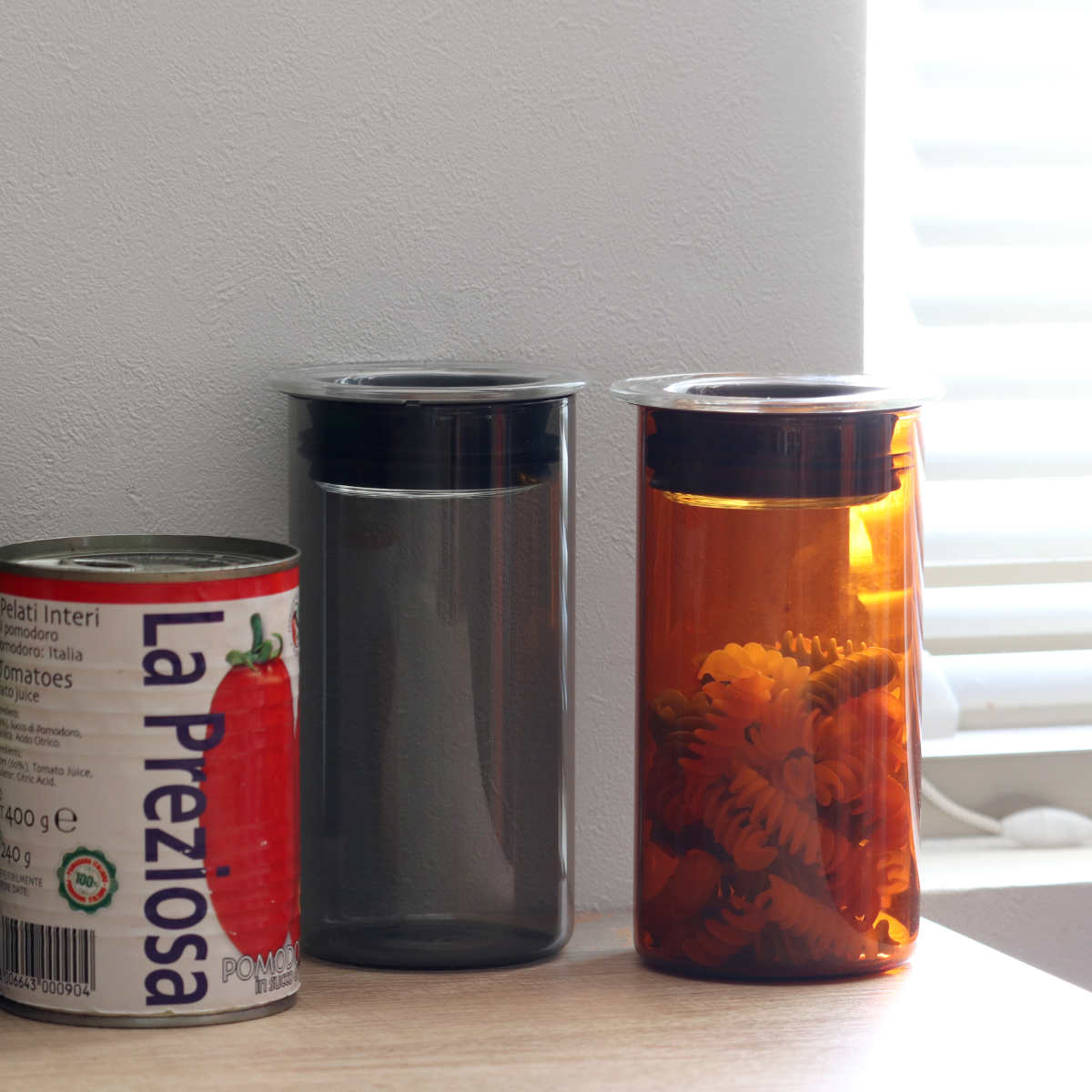 ●洗練されたカラーのガラスで、保存だけでなくインテリアにもなるキャニスターです。