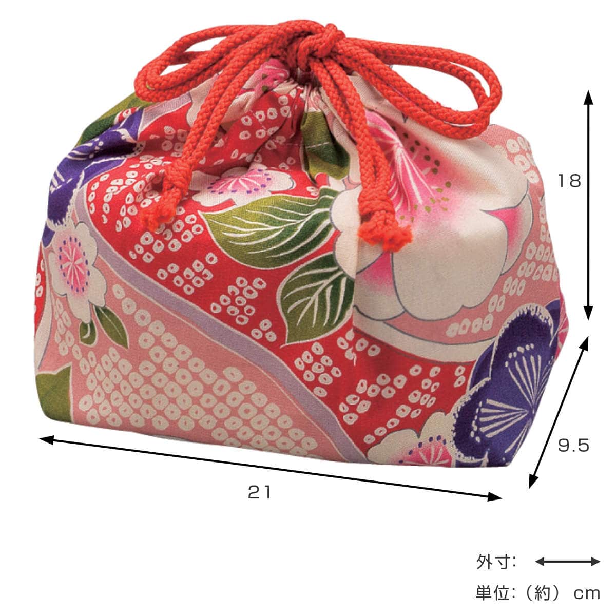 まるで着物のような上品な和柄が美しい、巾着袋です。日本の伝統文化を感じられる巾着袋が、毎日のランチタイムを華やかに彩ります。