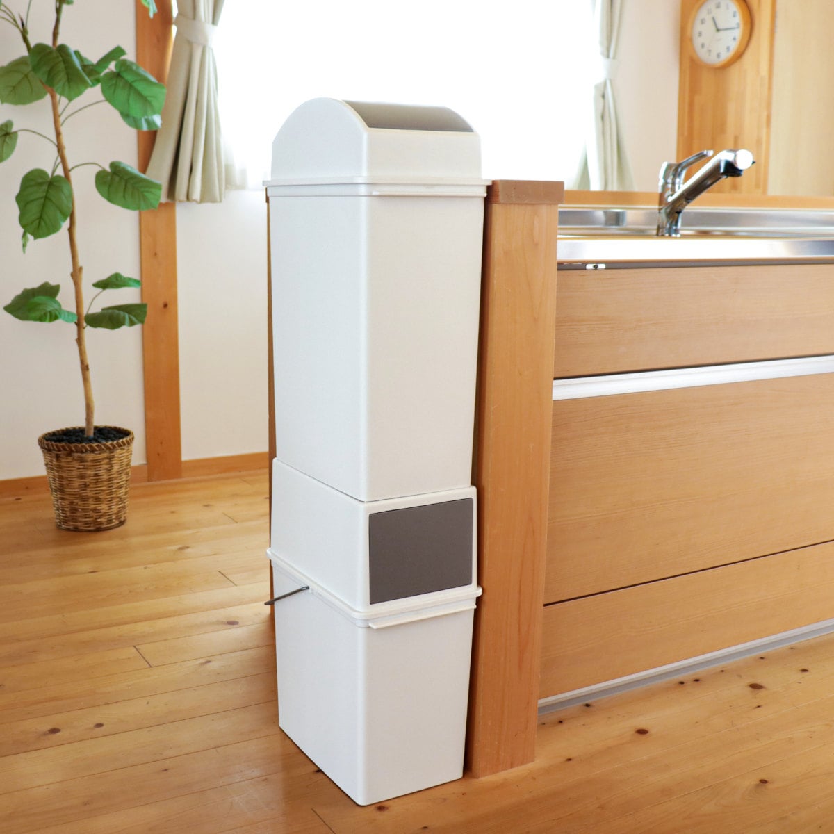 同シリーズのフロントオープンタイプを下段に置いて積み重ねることができるので、限られたスペースでもゴミを分別できます。