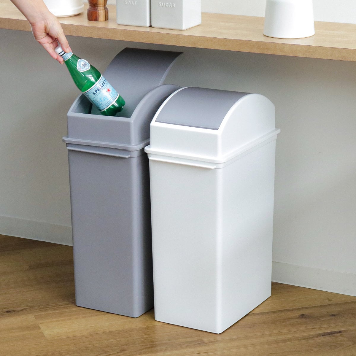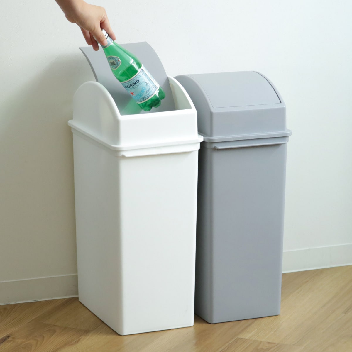 ゴミが捨てやすい開口部の広いスイングタイプです。上面がスイングするので子供でもゴミ捨てが簡単に行えます。ゴミを押し込めば開き、勝手に戻ってくるので、中身が見えないのもスイングタイプの良いところです。