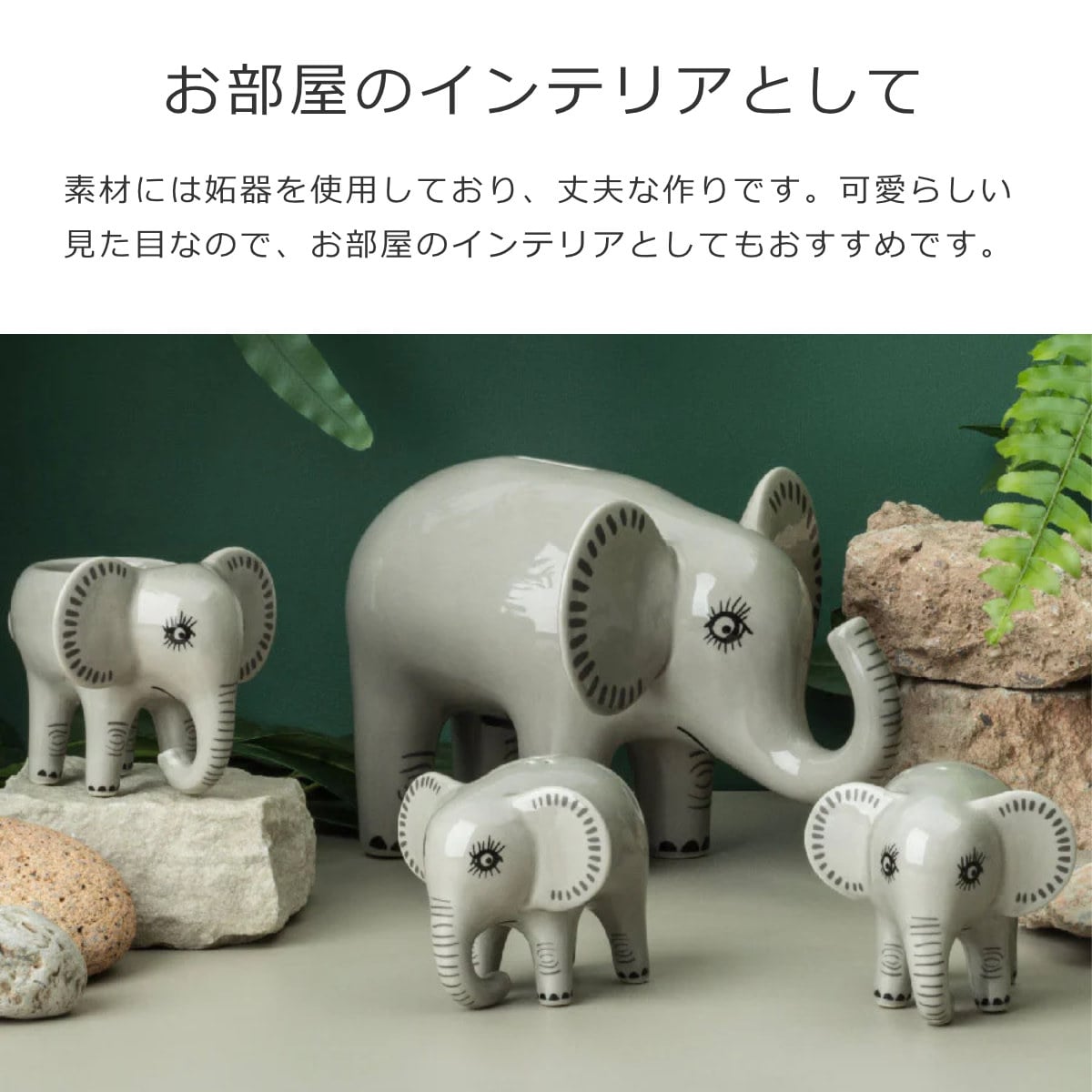 ゾウをモチーフにした貯金箱です。存在感のある大きな体でお金を大切に守ってくれます。