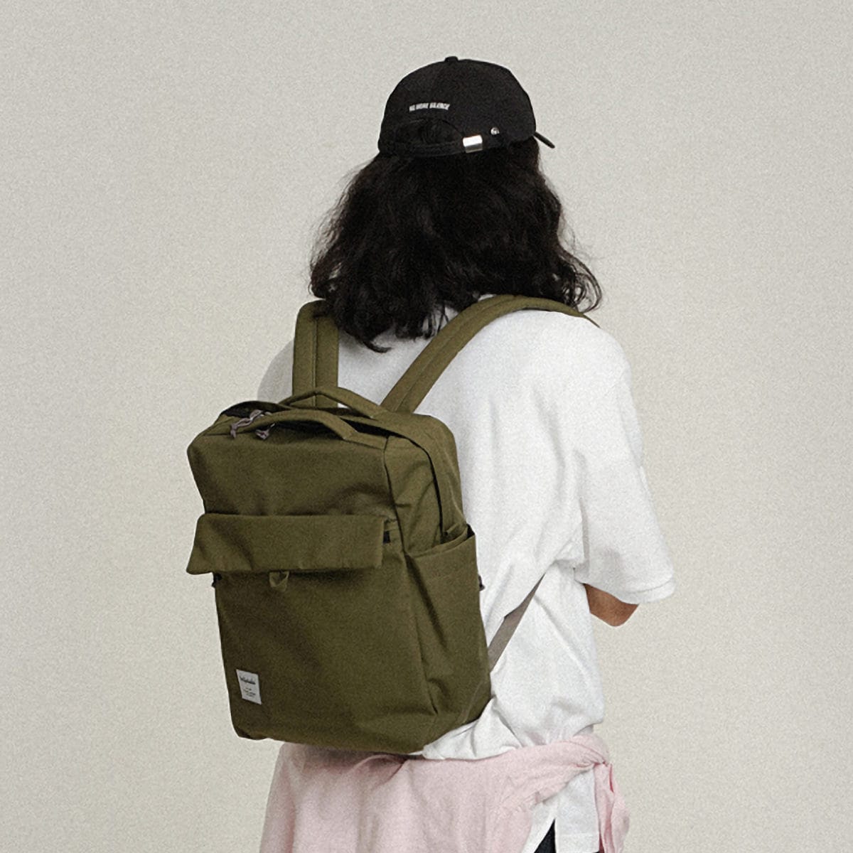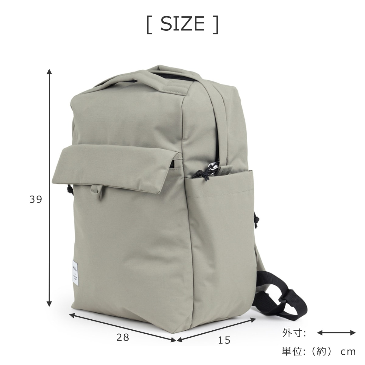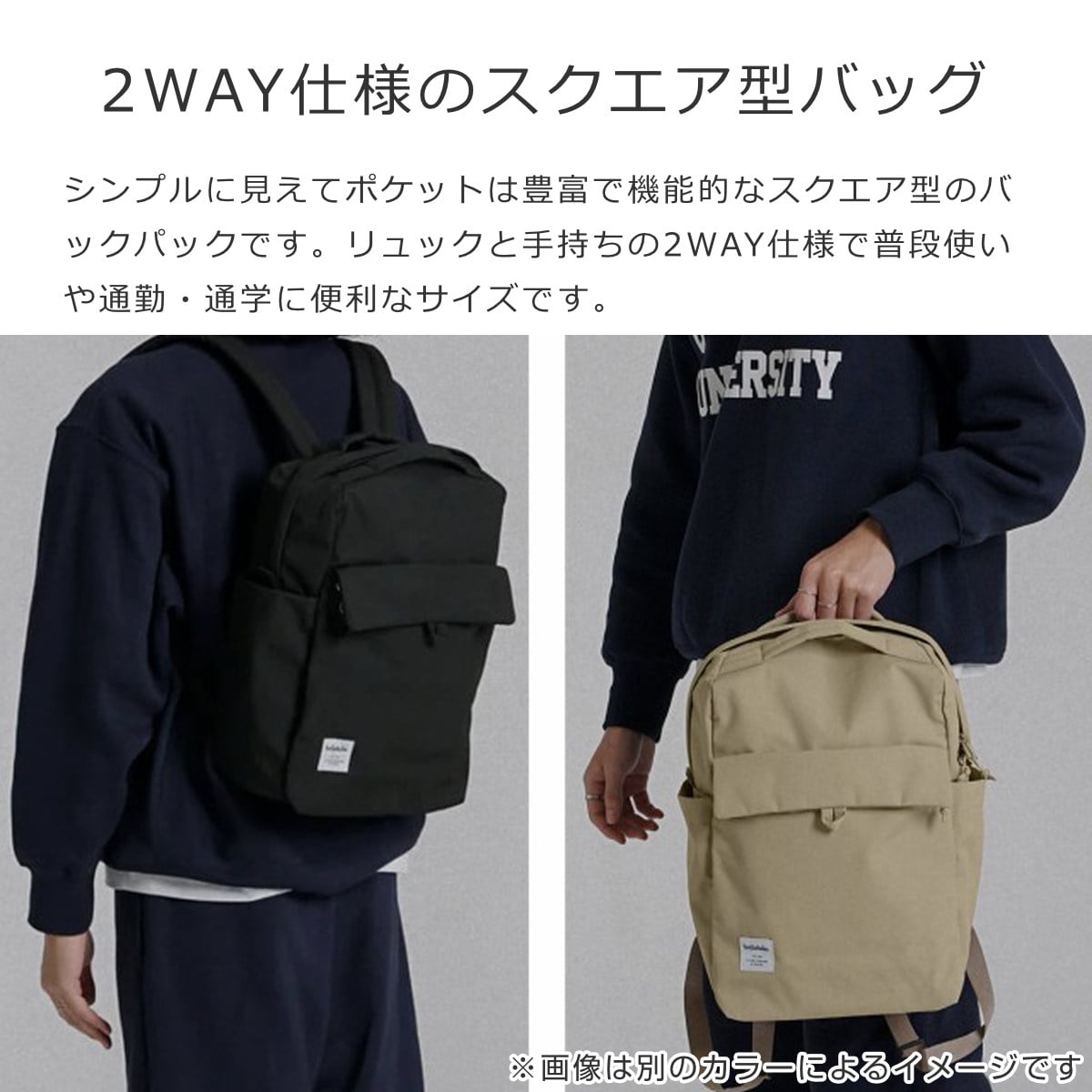 容量約13Lとたっぷり入るスクエア型のバックパックです。持ち手が付いた2WAY仕様なので、背負わない時も持ち運びしやすいです。16インチのノートPCが入る大きさなので、普段使いから通勤・通学まで幅広く使えます。