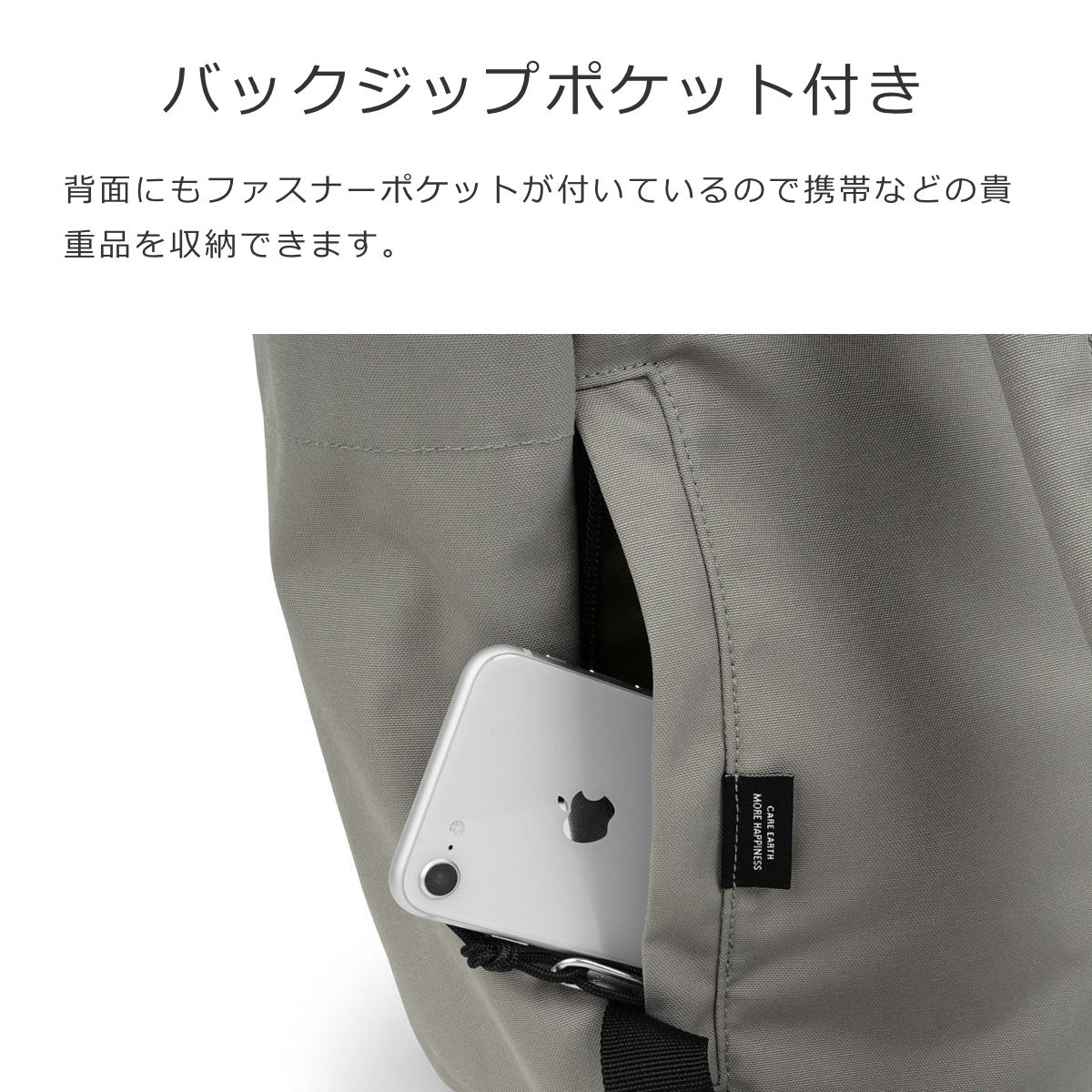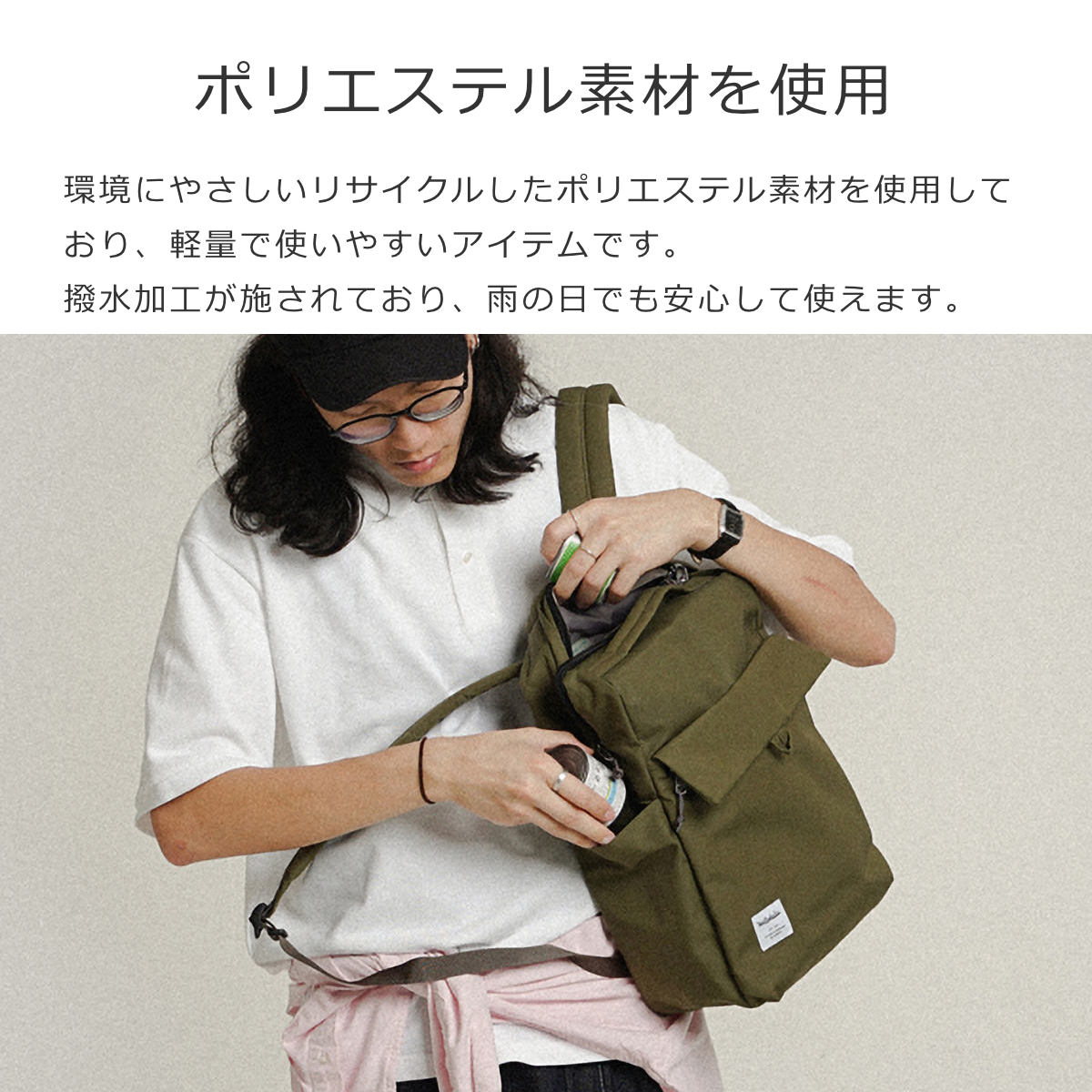 リサイクルしたポリエステル素材を使用しており、軽量で使いやすいだけでなく環境にもやさしいアイテムです。撥水加工が施されており、雨の日でも安心して使えます。