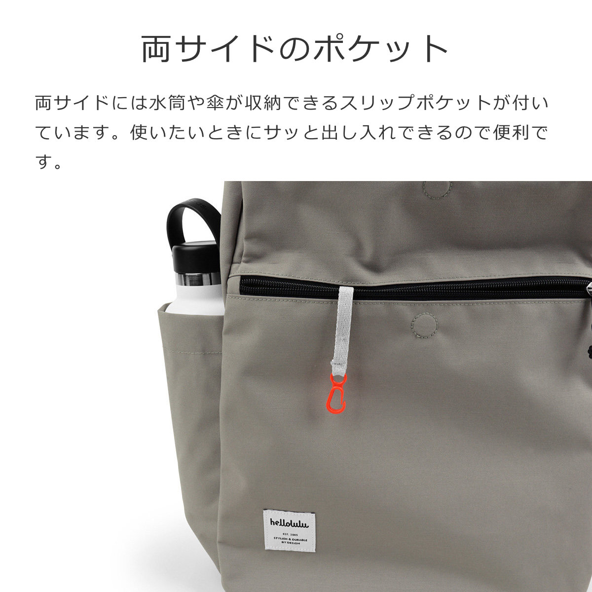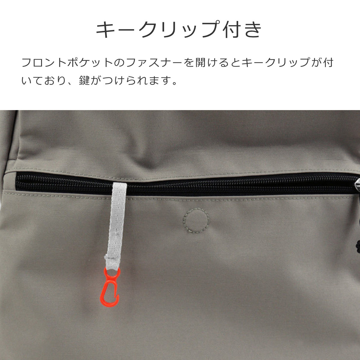 両サイドにはペットボトルやタンブラーが収納できるポケットが付いています。フロントポケットにはキークリップが付いており、鍵の迷子防止にもなります。