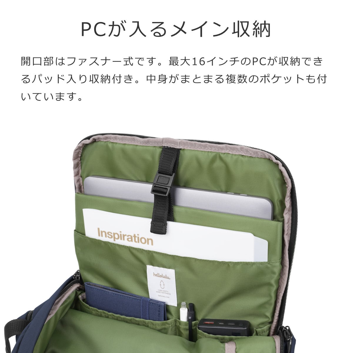 開口部はファスナー式です。最大16インチのノートパソコンが収納できるパッド入り収納付きです。複数のポケットも付いており、中身がすっきりまとまります。