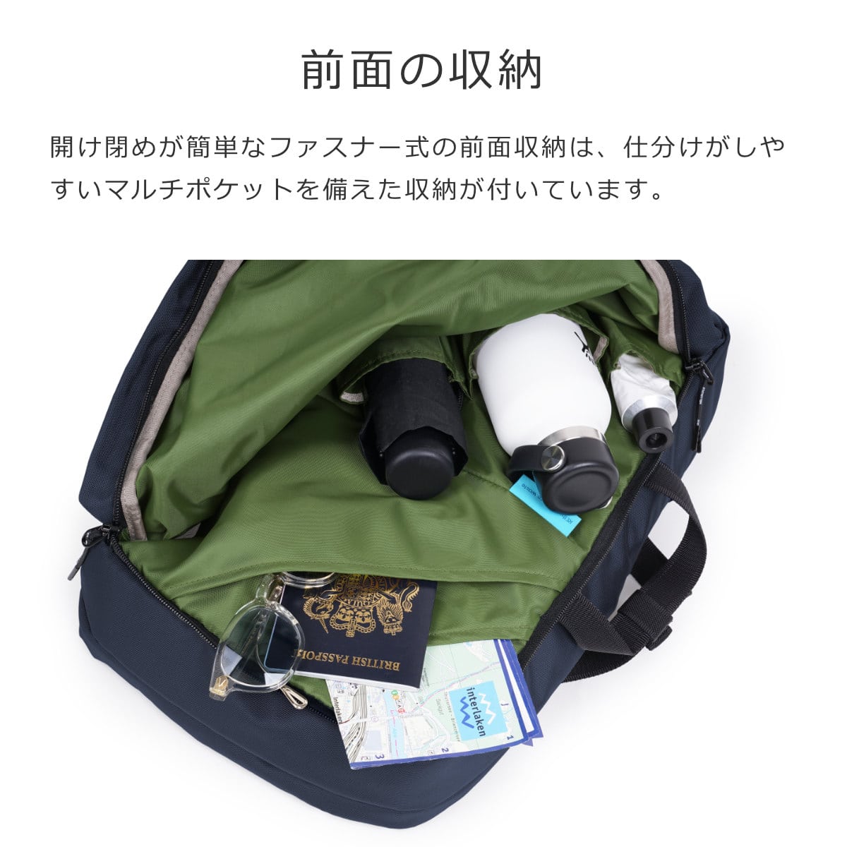 ファスナー式の前面収納は、仕分けがしやすいマルチポケットを備えた収納が付いています。