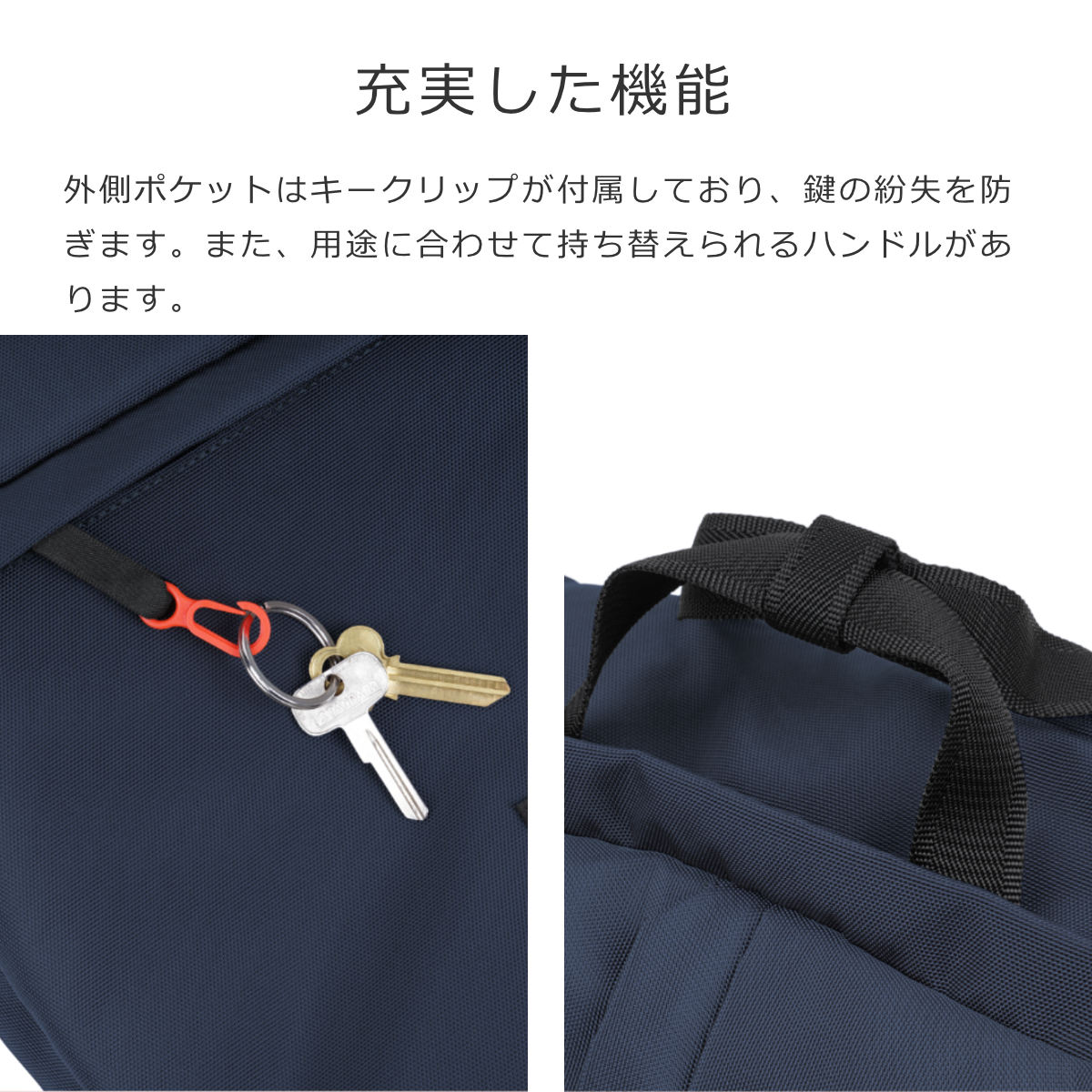 外側ポケットはキークリップが付属しているので、鍵の迷子防止になります。
