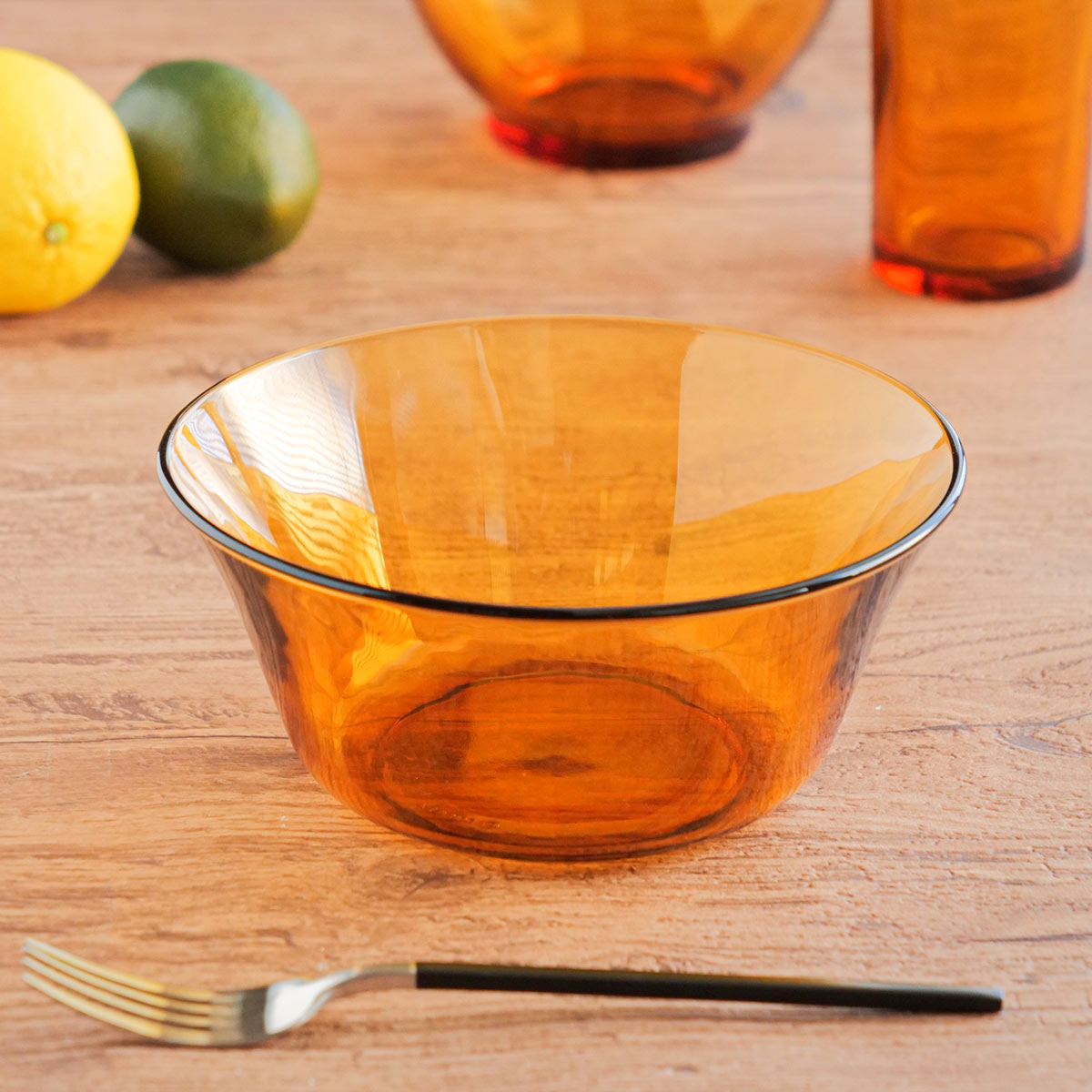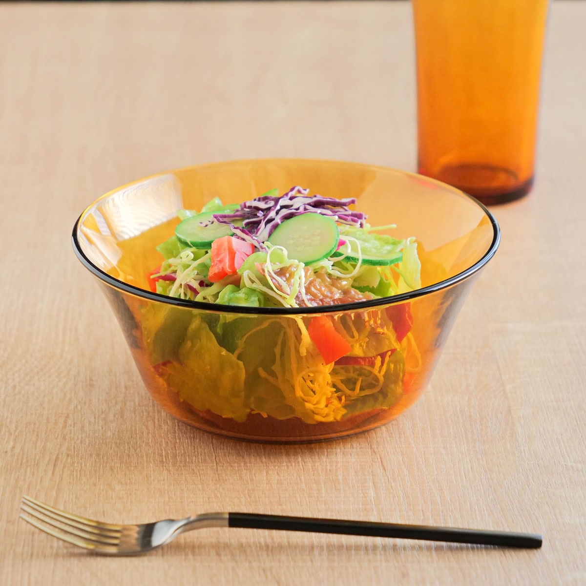レトロな雰囲気がお洒落なアンバーカラーのボウルです。取り分け用のサラダ、一人分の麺鉢や丼ぶりにも使える大きさです。