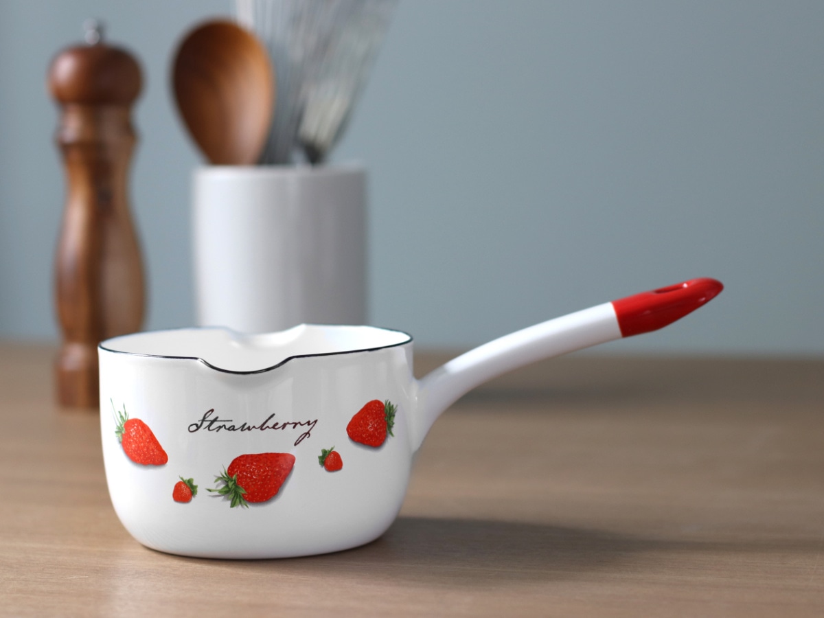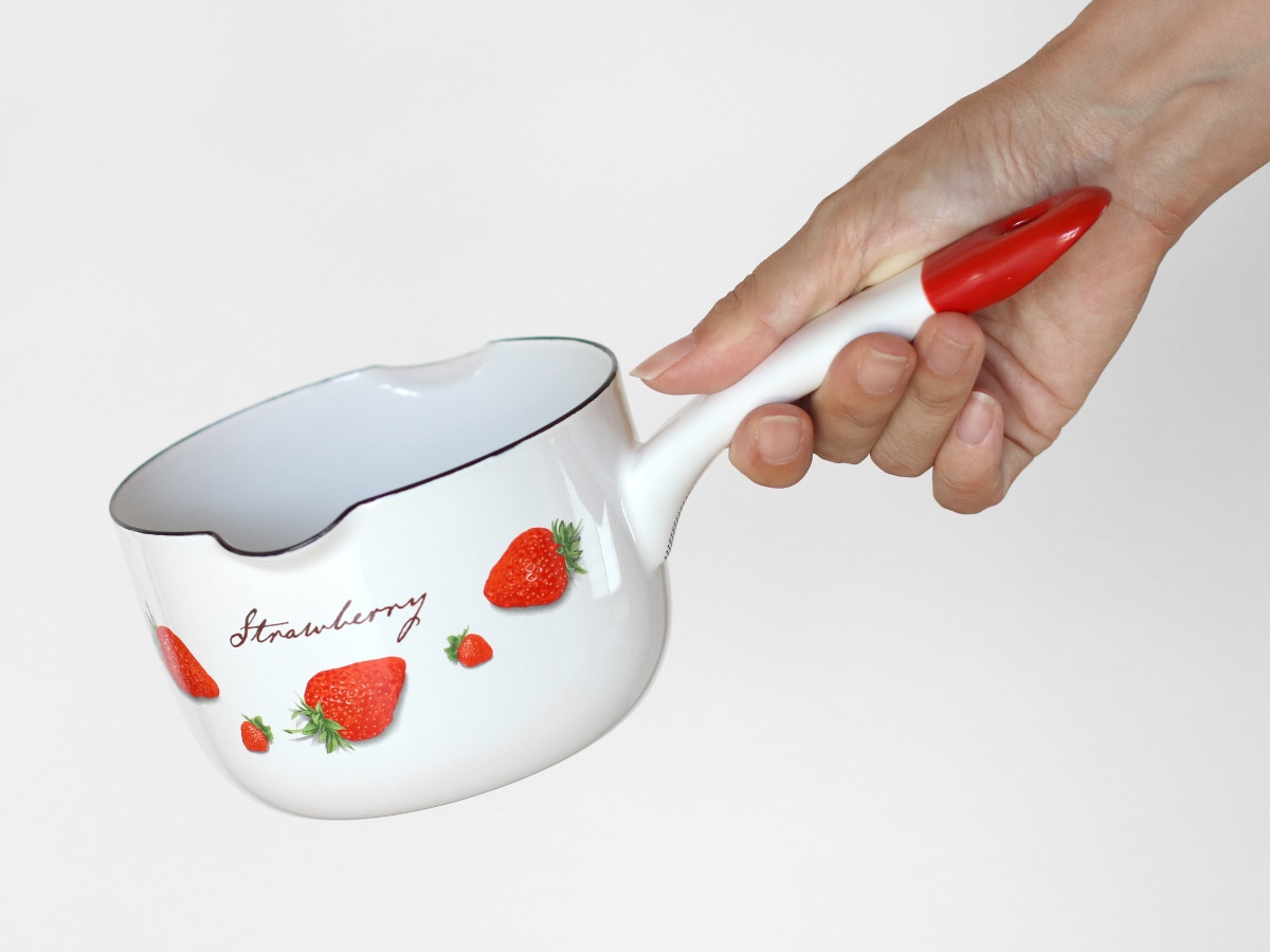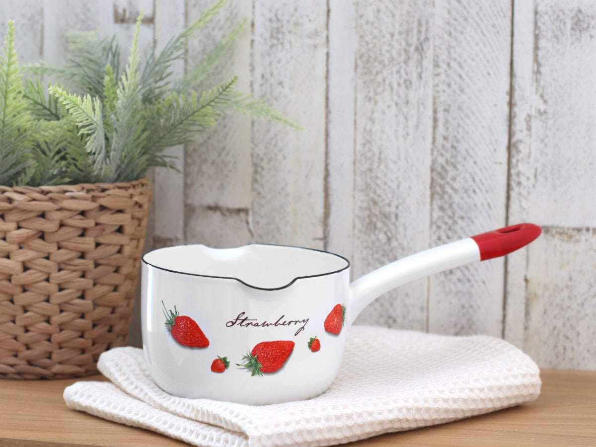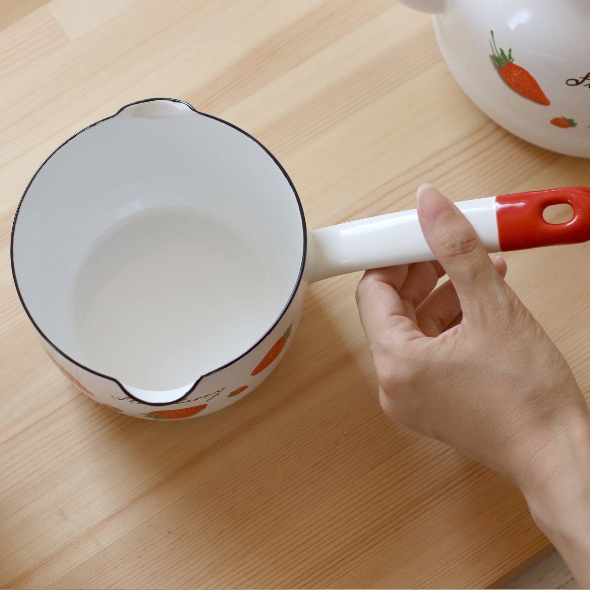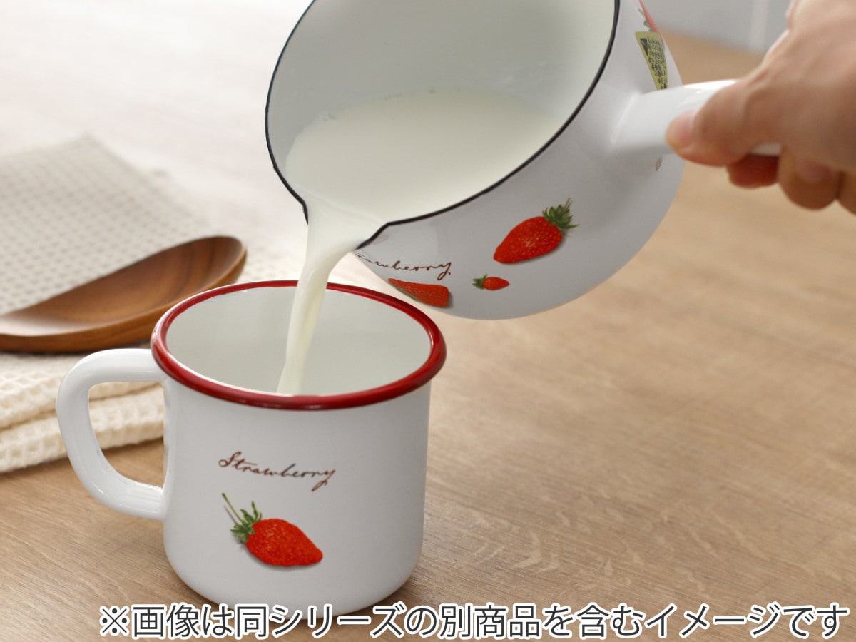いちご柄のレトロなデザインがかわいいホーロー製ミルクパンです。熱効率の良いホーロー製なので、ミルクやお湯が早く沸きます。