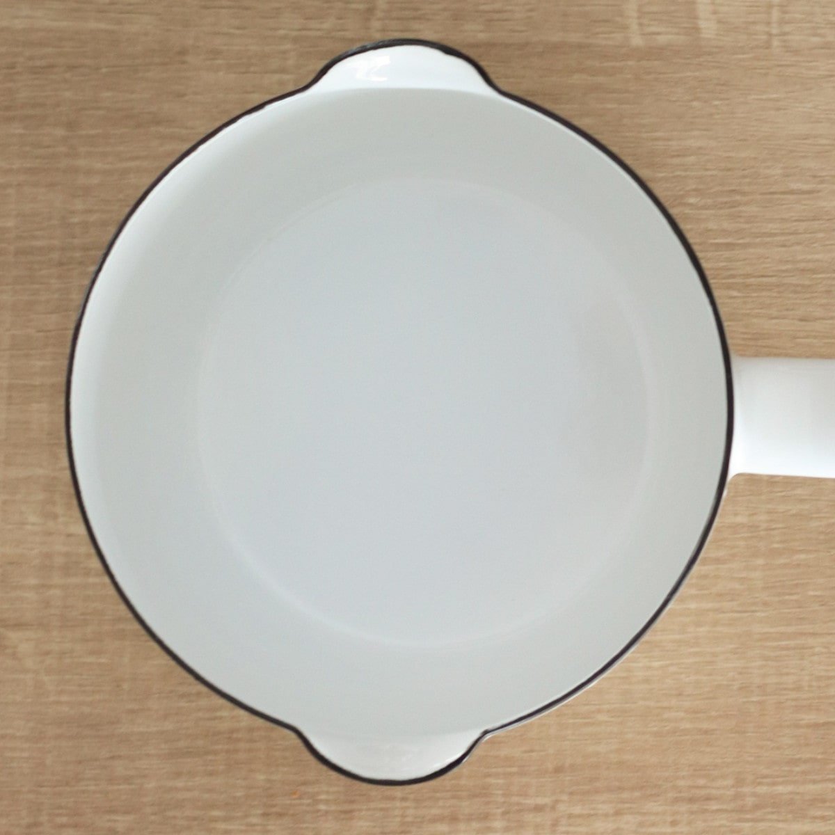 ※ホーロー製品は手作業で釉薬(ゆうやく)をかけるため、縁や裏側に塗りムラが起こります。また、焼成の際に吊るして炉に入れるため、縁や取っ手の裏側に金具の跡が残る場合があります。
