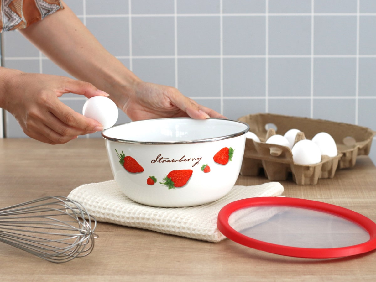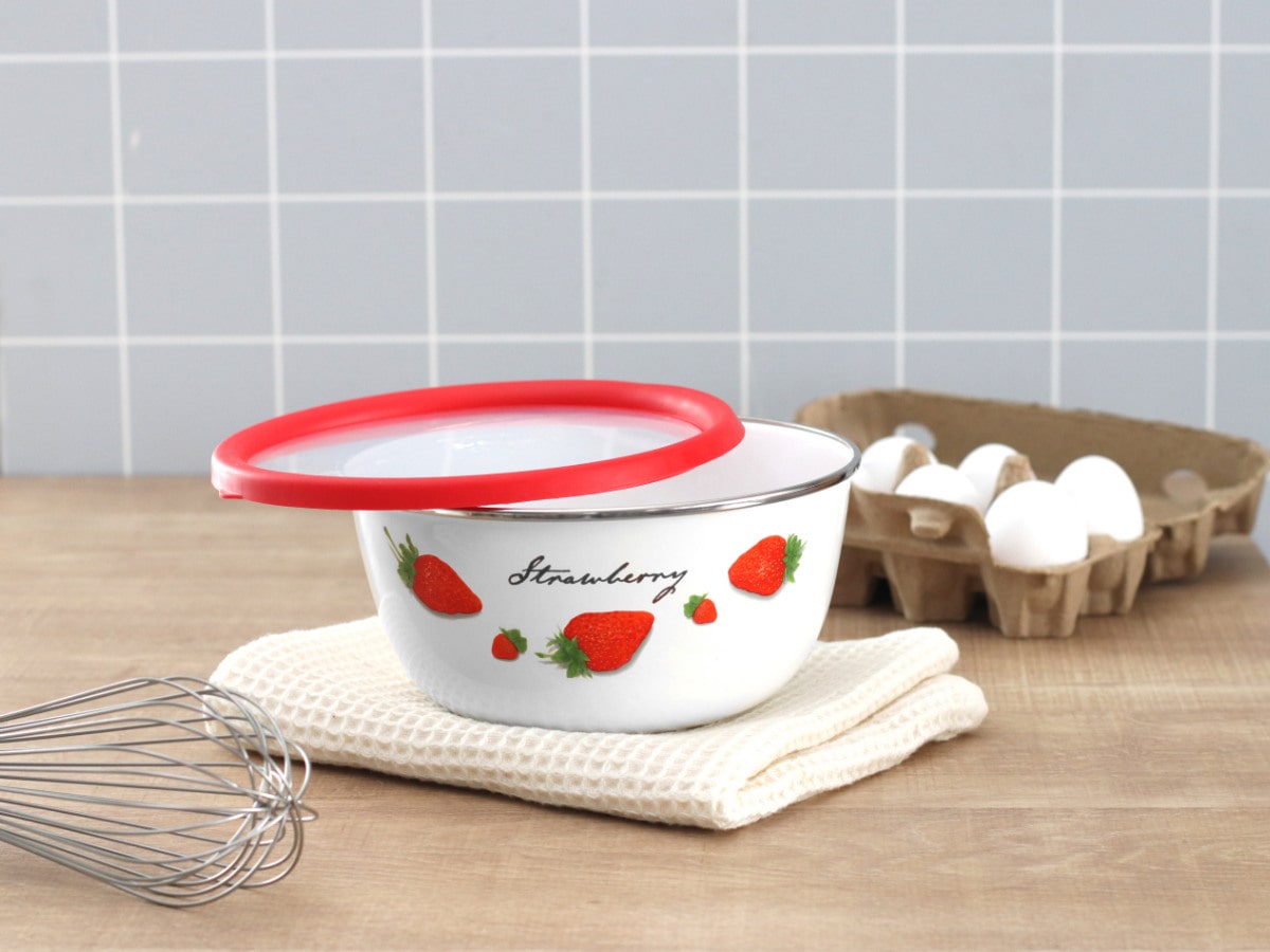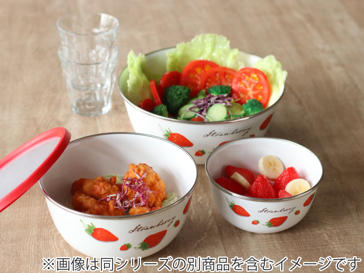 いちご柄のレトロなデザインがかわいいホーロー製のミキシングボウルです。サイズ18cmのボウルは、サラダ等の下ごしらえや2~3人分の主菜の保存など、オールマイティに使えてあると便利な大きさです。