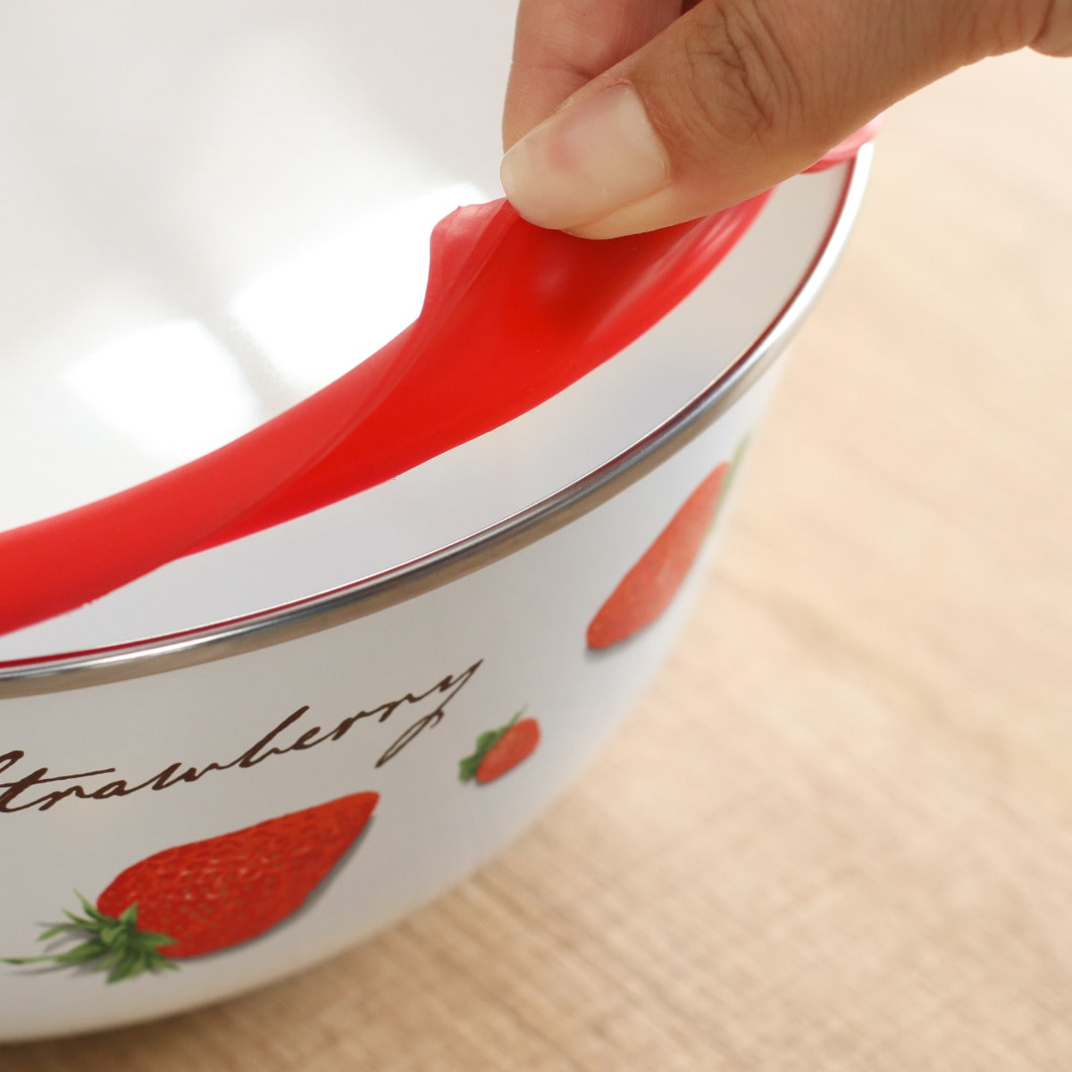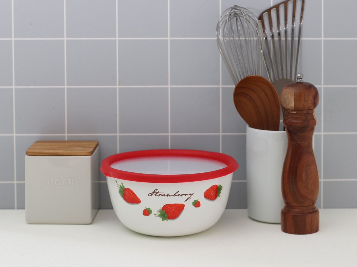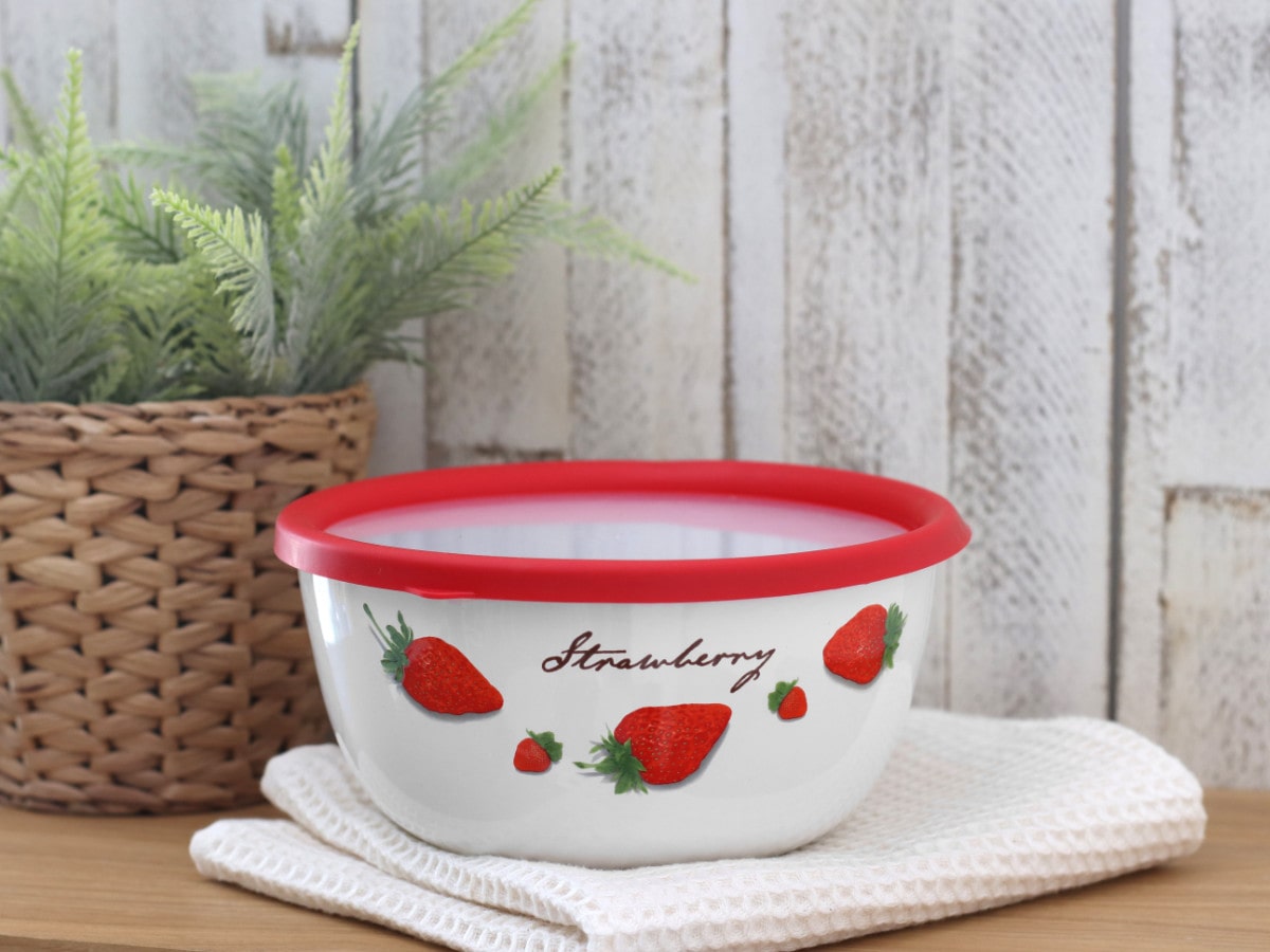 いちご柄のレトロなデザインがかわいいホーロー製のミキシングボウルです。サイズ18cmのボウルは、サラダ等の下ごしらえや2~3人分の主菜の保存など、オールマイティに使えてあると便利な大きさです。