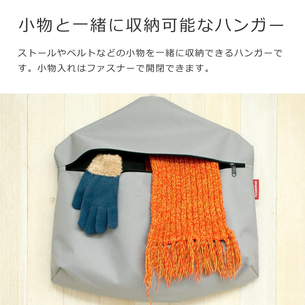 ストールやベルトなどの小物を一緒に収納できるハンガーです。小物入れはファスナーで開閉できます。