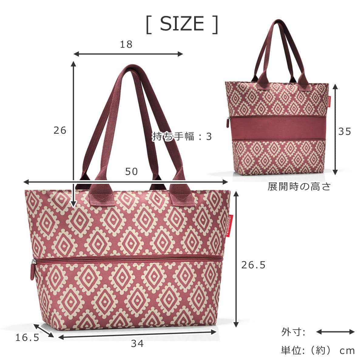 | サイズ | 約 幅50×奥行16.5×高さ26.5~35(cm) 持ち手:約 幅18×高さ26×奥行3(cm) (高さは根本より計測) |