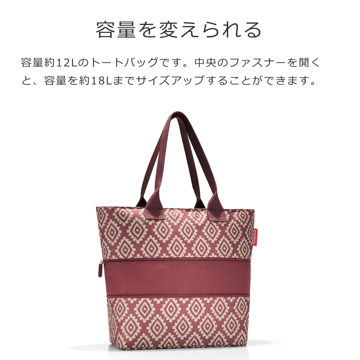 容量約12Lのトートバッグです。中央のファスナーを開くと、容量を約18Lまでサイズアップすることができます。