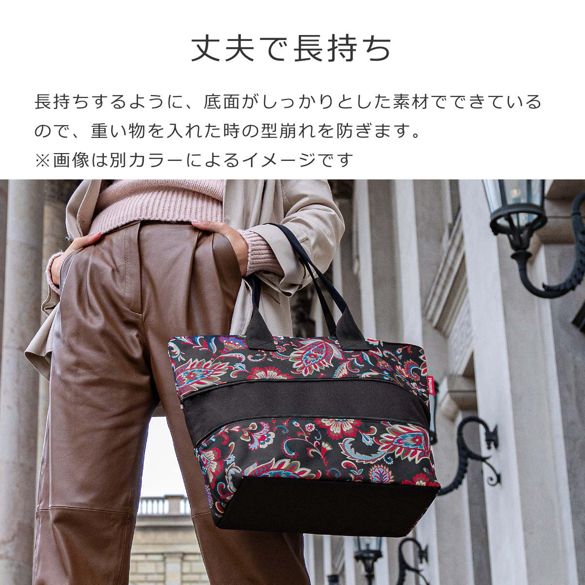 長持ちするように、底面がしっかりとした素材でできているので、重い物を入れた時の型崩れを防ぎます。