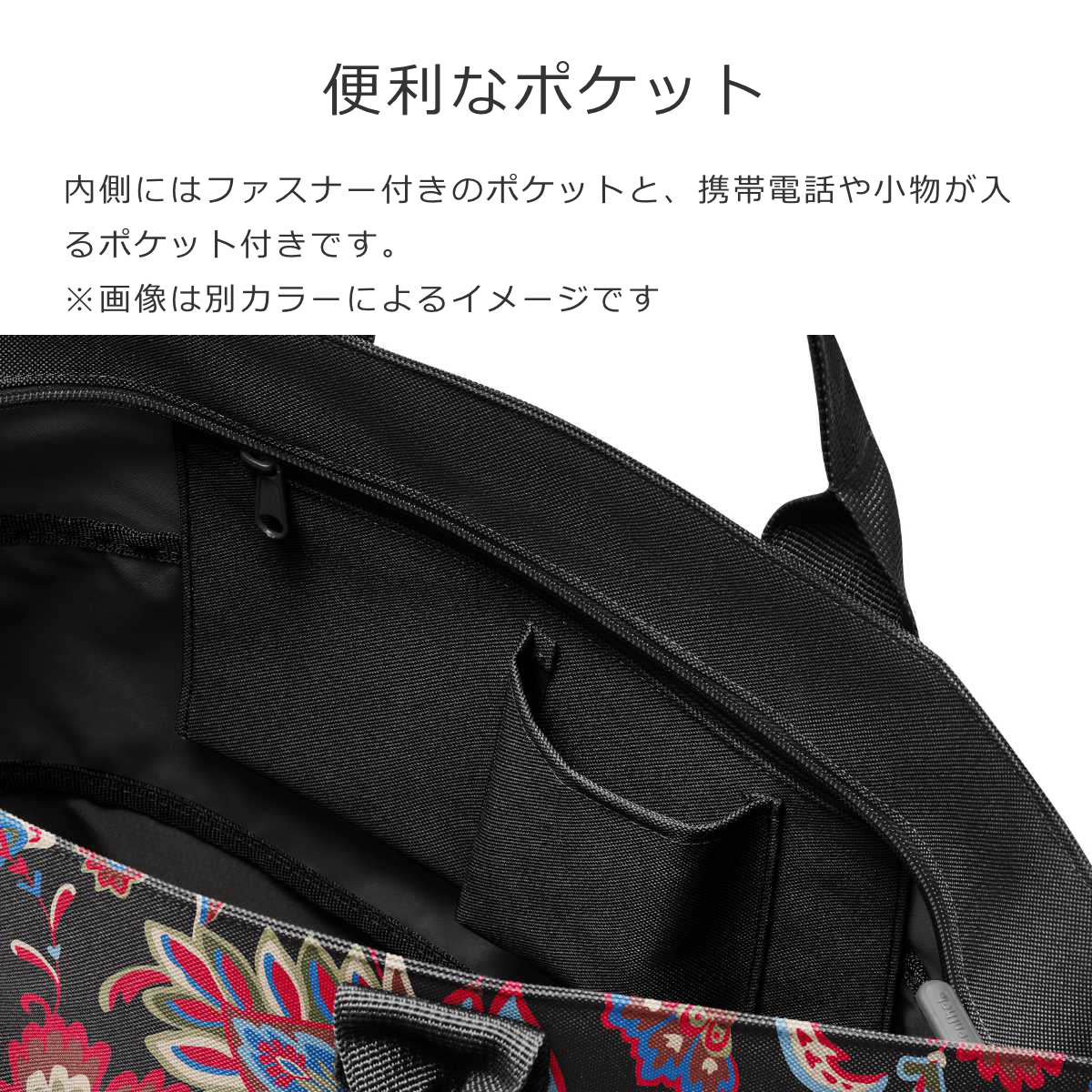 内側にはファスナー付きのポケットと、携帯電話や小物が入るポケット付きです。
