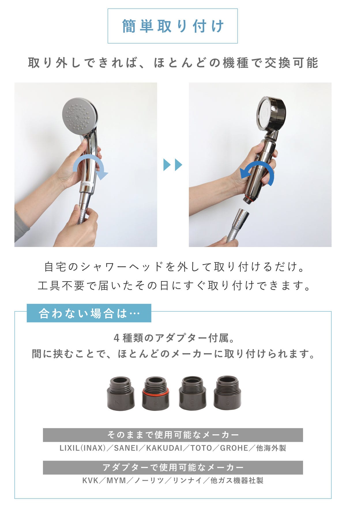 | 内容量 | 1個 付属品:取扱説明書、アダプター4種、シリコンホールド4個、LIXIL用平パッキン2個、保証登録カード、不要アダプター/保証登録カード回収用封筒 |