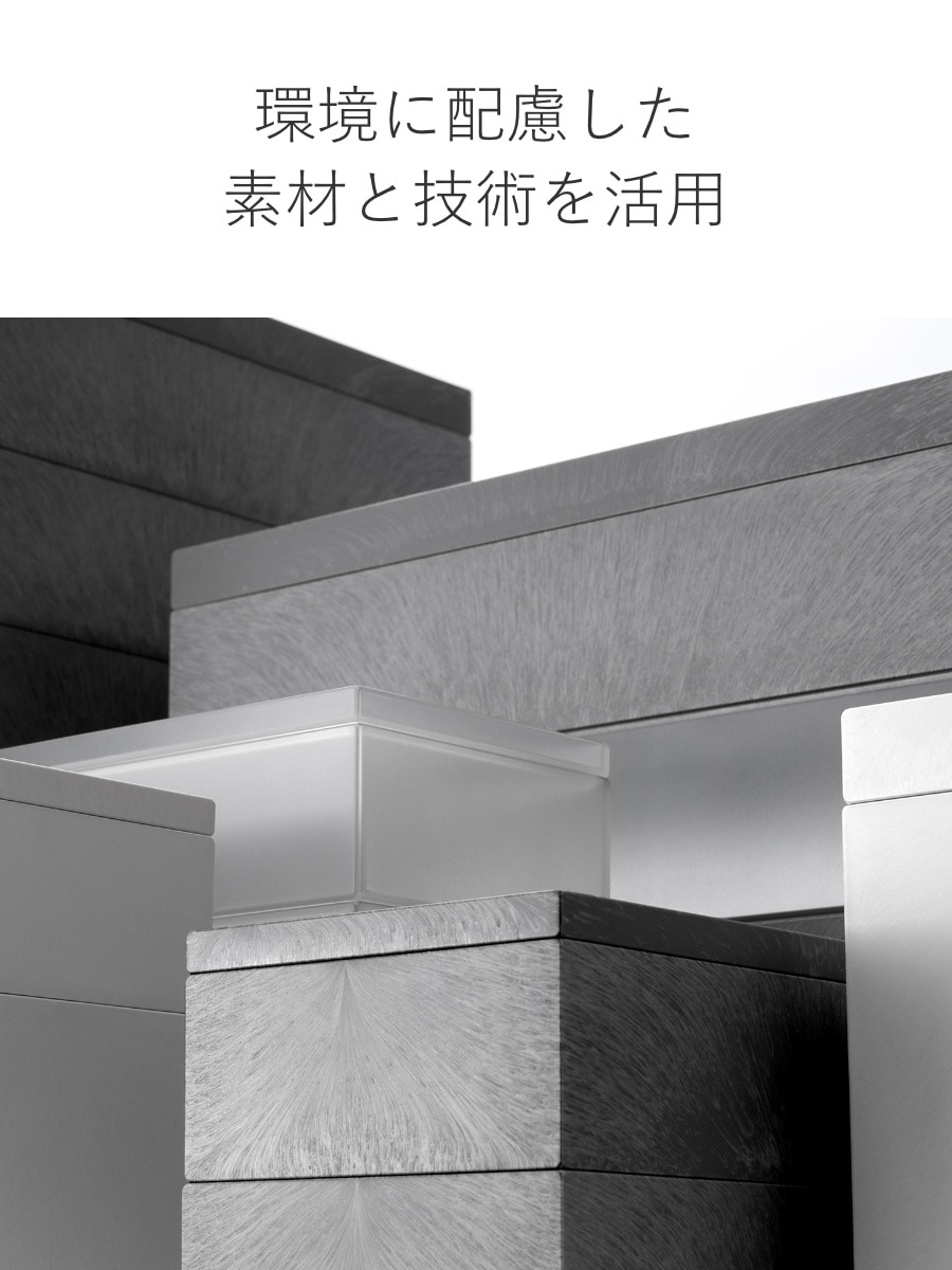再生材を80%配合し、ホワイトとグレーには発泡成形を採用しています。成形時に気泡を混ぜ込む事により、樹脂使用量の削減と軽量化を実現。地球にやさしい環境配慮商品です。また、気泡を充填した際に表面に現れる特徴的な模様を活かした、存在感のあるアイテムに仕上がっています。