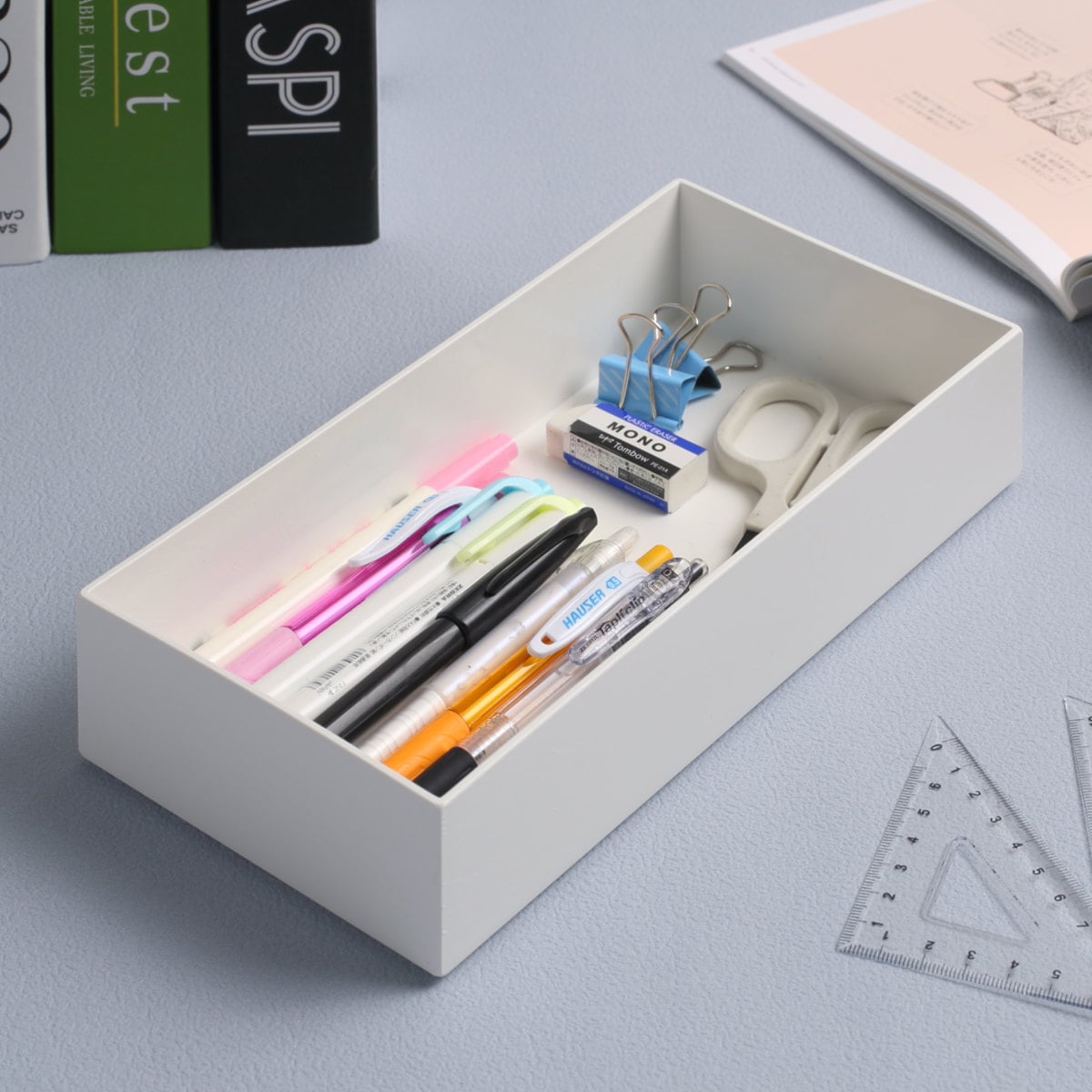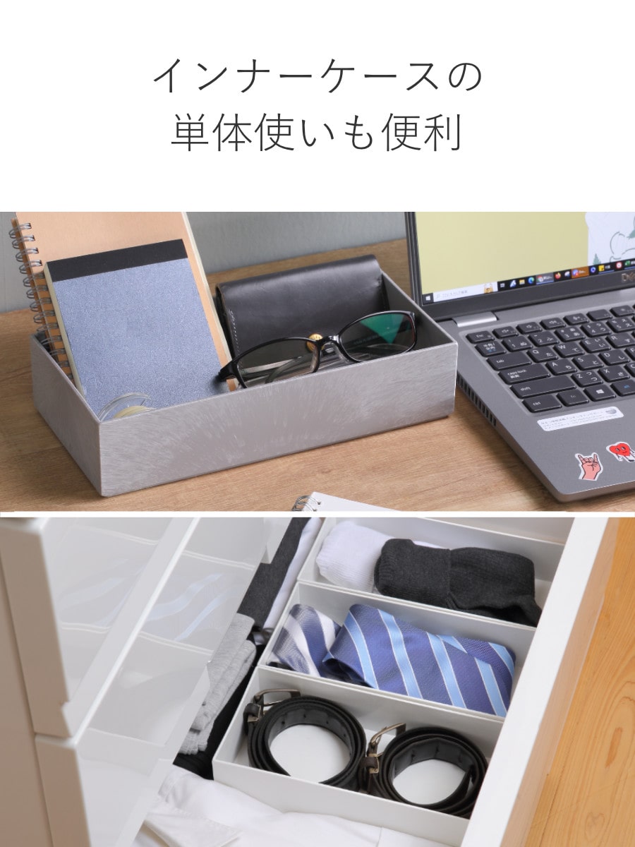インナーケースは単体でも便利にお使いいただけます。そのまま一つで使ったり、同じサイズを棚や引き出しの中で並べて仕切り収納に使ったりと、様々なシーンで活躍してくれます。一般的なカラーボックスに3列にぴったり収まるので、並べるだけで見た目もすっきりとした無駄のない収納を実現できます。