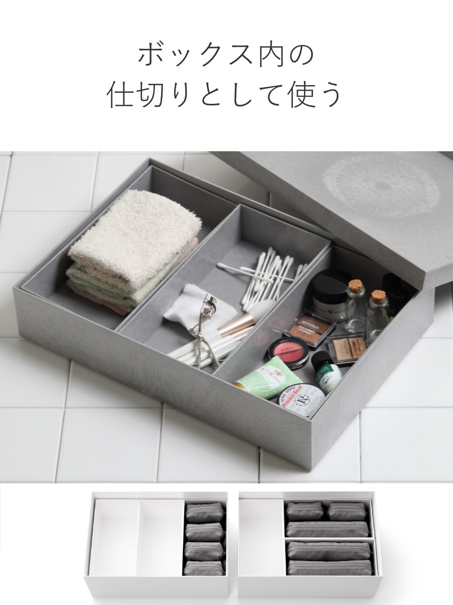 インナーケースは、別売りの収納ボックス内の仕切りとしてもお使いいただけます。ボックス内にインナーが3個収まるサイズで、縦縦縦にも縦横横にも組み合わせられるモジュール設計なので、収納する物に合わせて使い分けができます。さらに、同じシリーズにインナーケースにぴったり収まるポーチもあるので、収納の幅が広がります。ボックスごとに用途や種類別に分けて置く場所も決めておけば、探す手間が省けてより快適な生活空間が手に入ります。