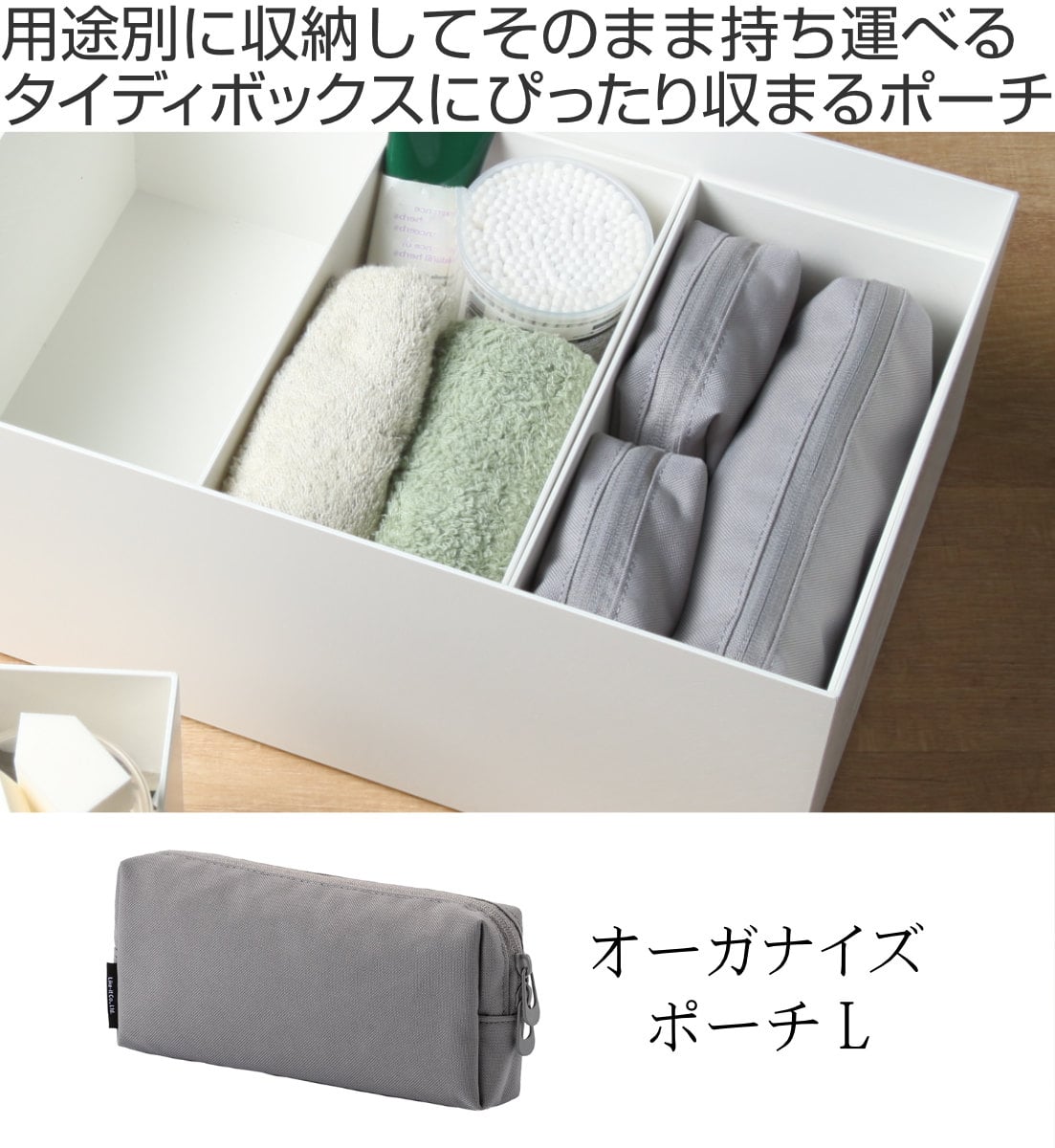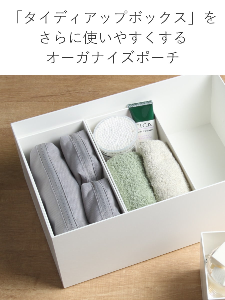オープンシェルフの整理整頓が上手にできる、究極にシンプルな収納箱「タイディアップボックス」シリーズをさらに使いやすくしてくれるオーガナイズポーチです。