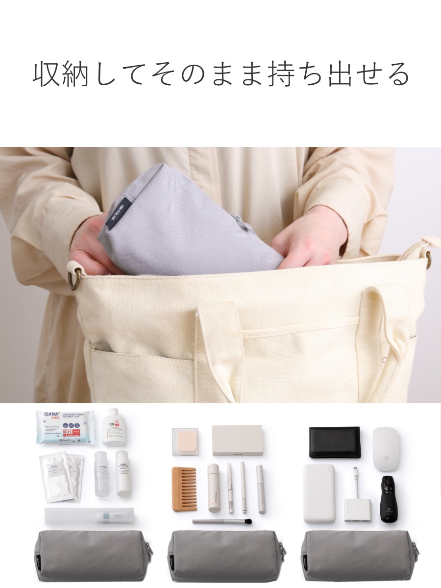 シンプルなポーチなので単体としても汎用性が高く、メイク道具、ガジェット類、トラベル用品や薬類など、用途別にひとまとめにしておけば、お出かけの際にそのままカバンに入れて持ち出せるので便利です。