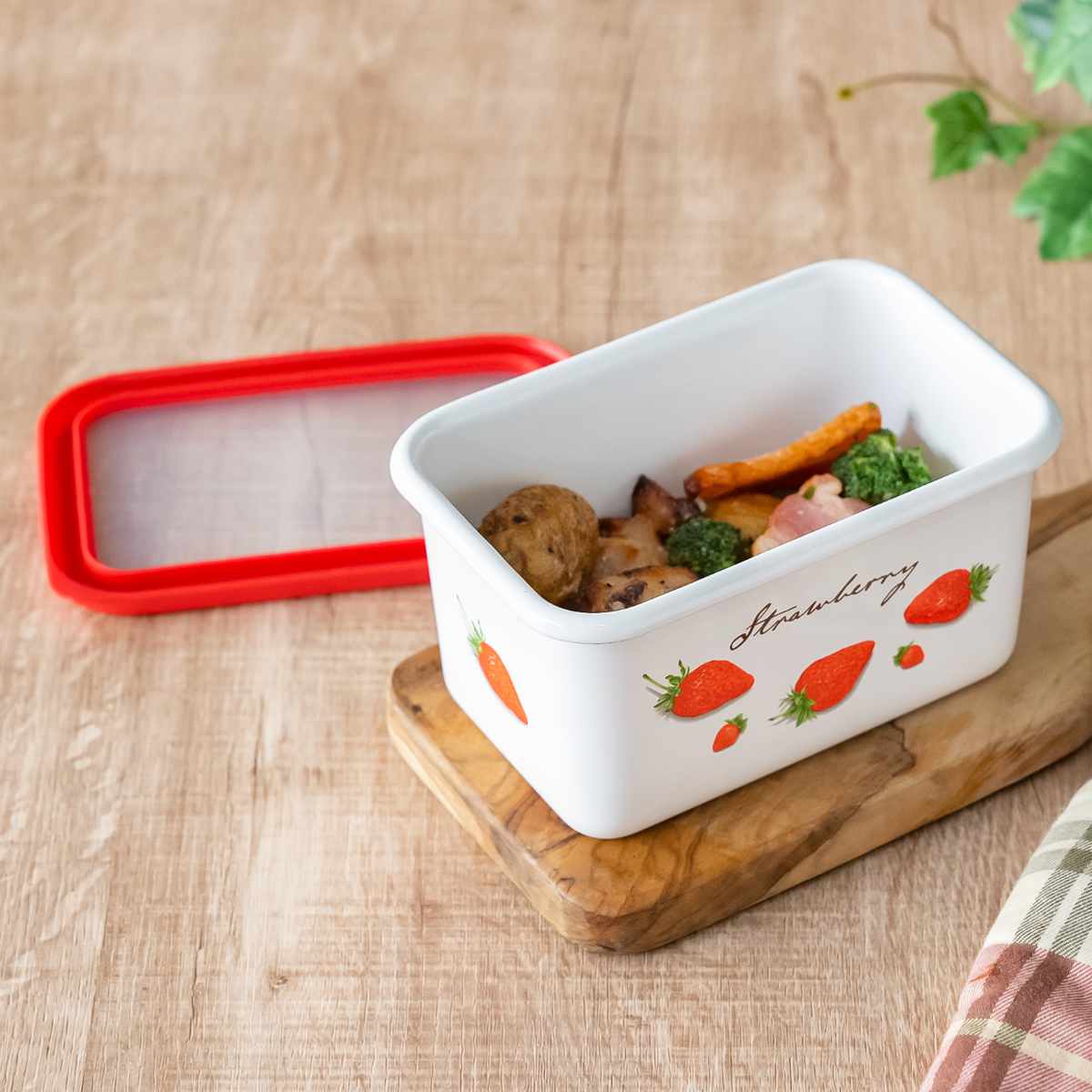 バット代わりに使って下ごしらえ、そのまま直火やオーブンにかけて調理と保存以外にも活躍します。レトロな雰囲気と鮮やかなデザインは、冷蔵庫から出してそのまま食器として食卓で使用することができます。