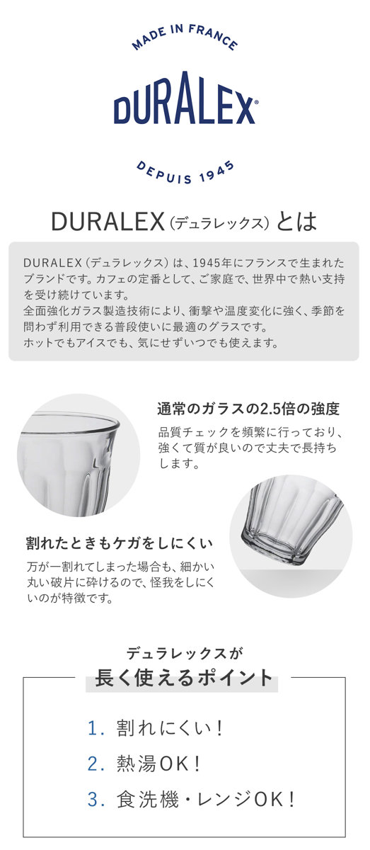 | 注意事項 | ※商品ページ内には別の商品を含む画像を使用しています DURALEX製品は、製造上、気泡やすり傷、しわ模様、飲み口の凹凸、底面の線、軽いぐらつきなどが見られる場合があります。 これらは製品の特性で、ご使用には問題ありません。 そのため、不良品ではなく返品・交換の対象外となります。 あらかじめご了承のうえ、ご購入をお願いいたします。 |