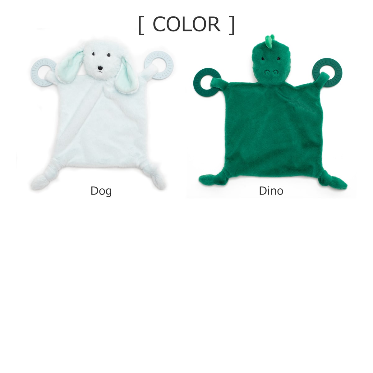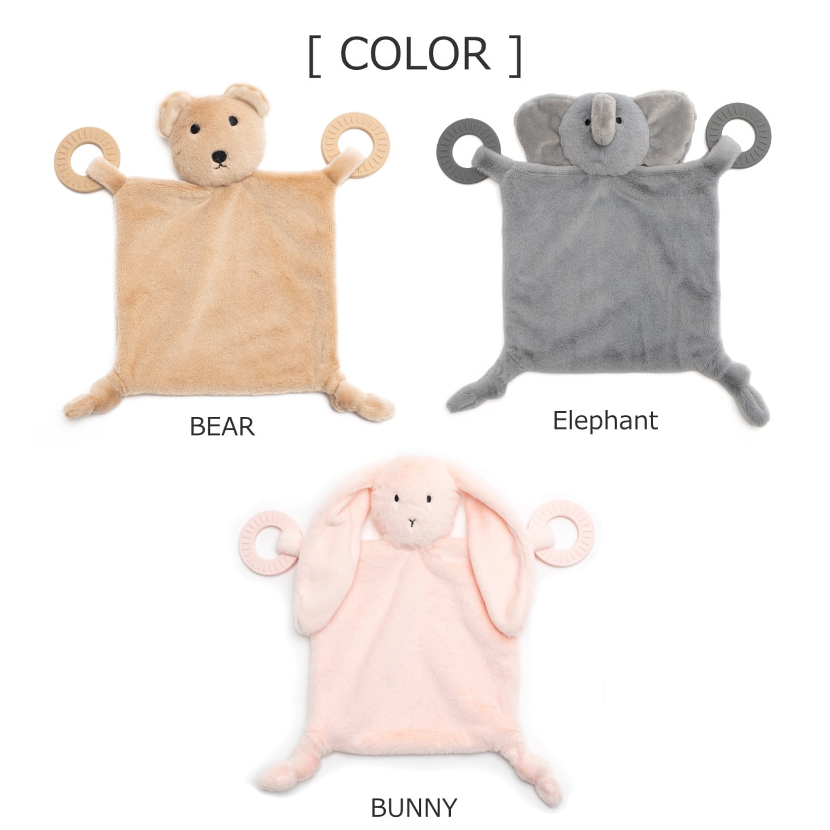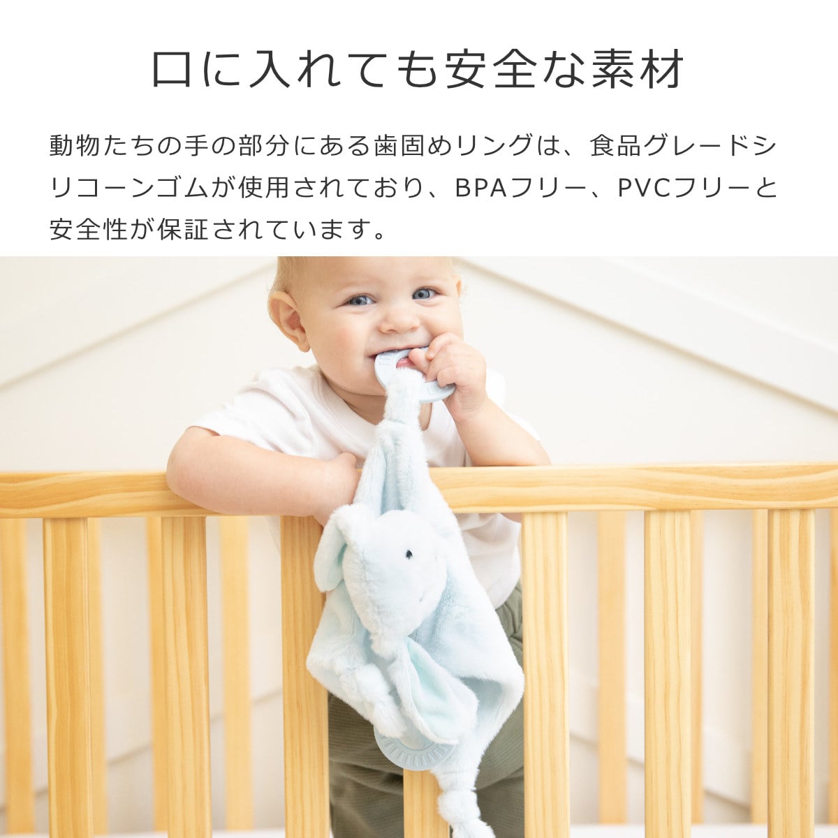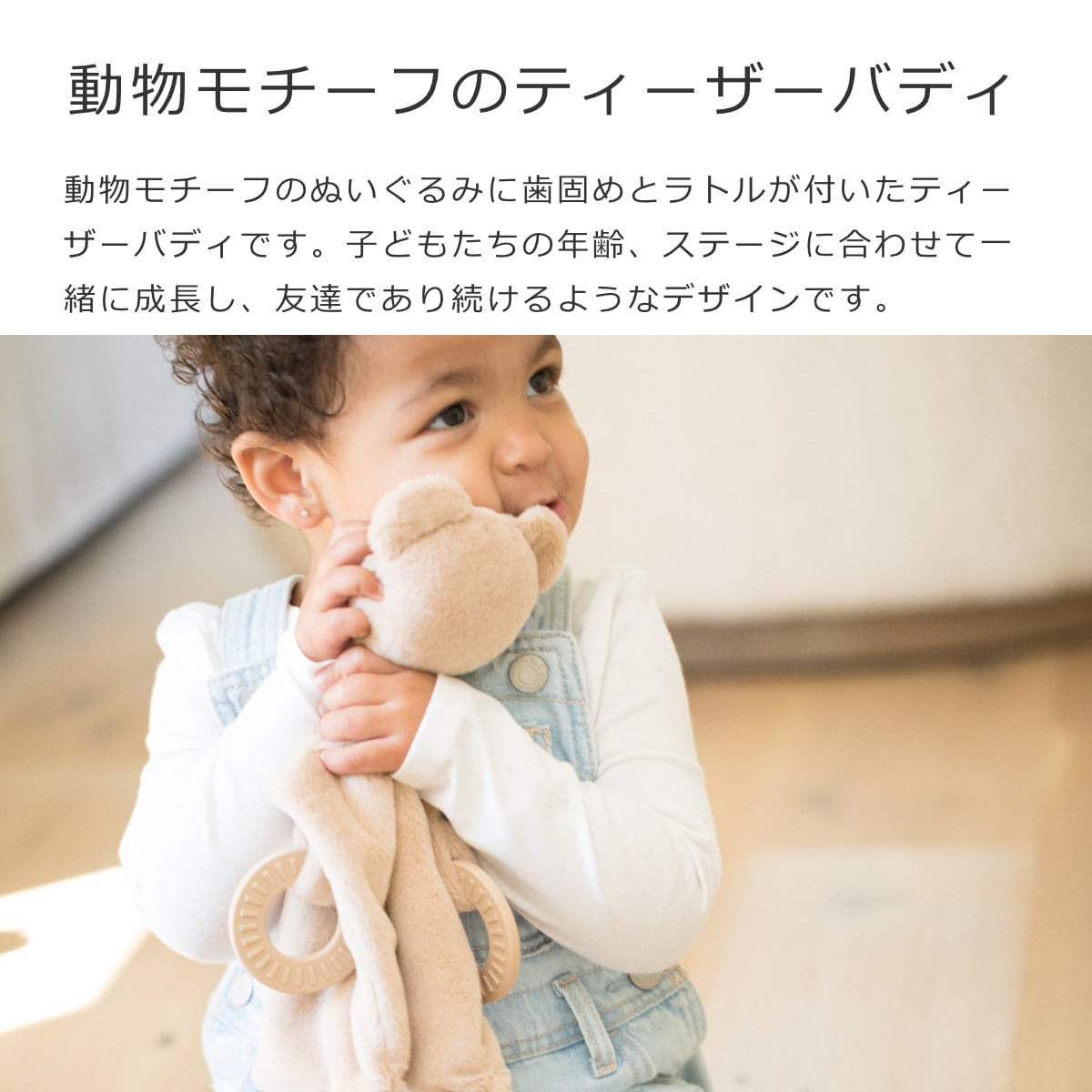 動物モチーフのぬいぐるみに歯固めとラトルが付いたティーザーバディです。子どもたちの年齢、ステージに合わせて一緒に成長し、友達であり続けるようにデザインされています。