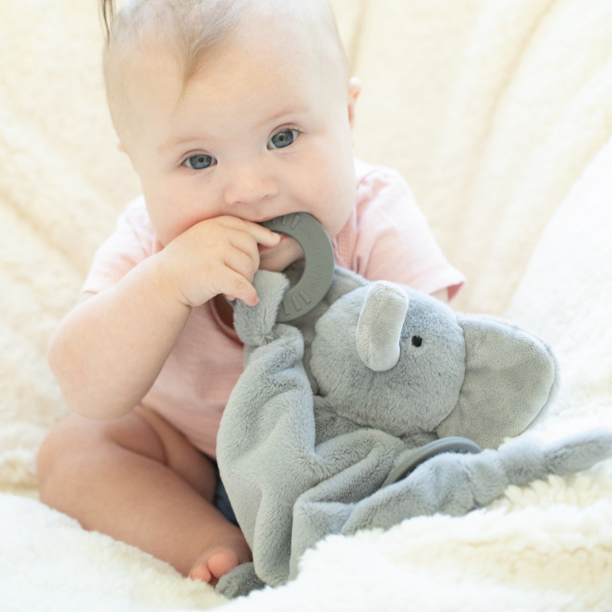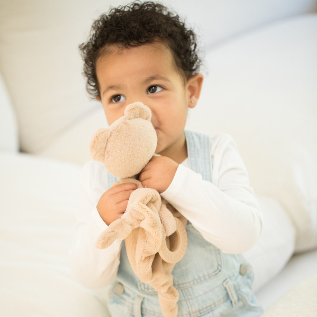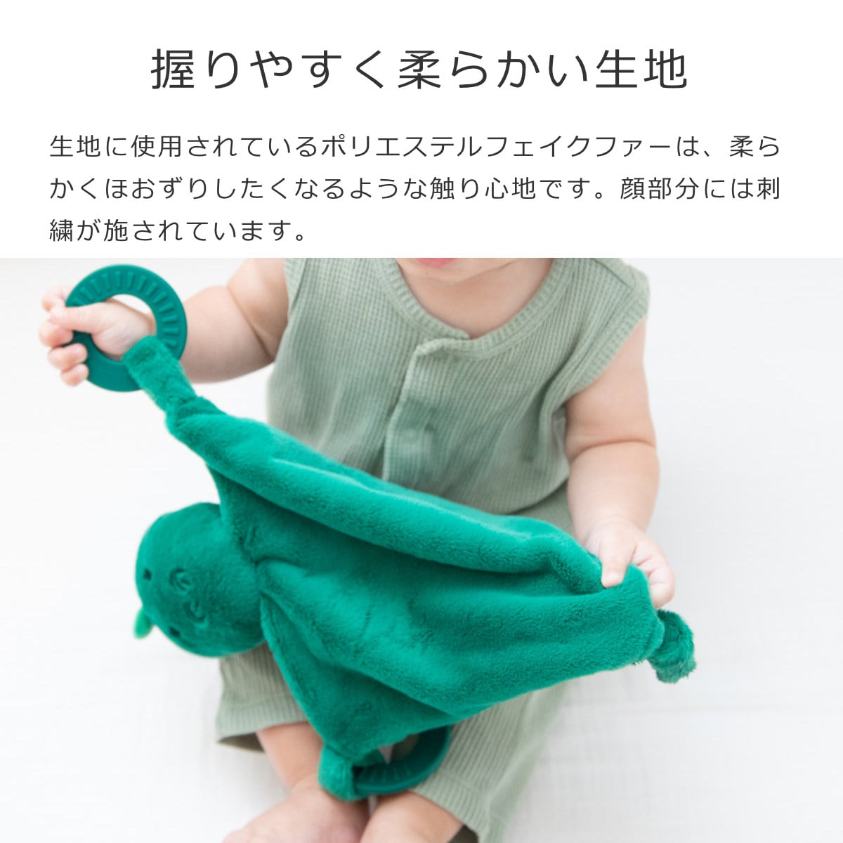 動物モチーフのぬいぐるみに歯固めとラトルが付いたティーザーバディです。子どもたちの年齢、ステージに合わせて一緒に成長し、友達であり続けるようにデザインされています。