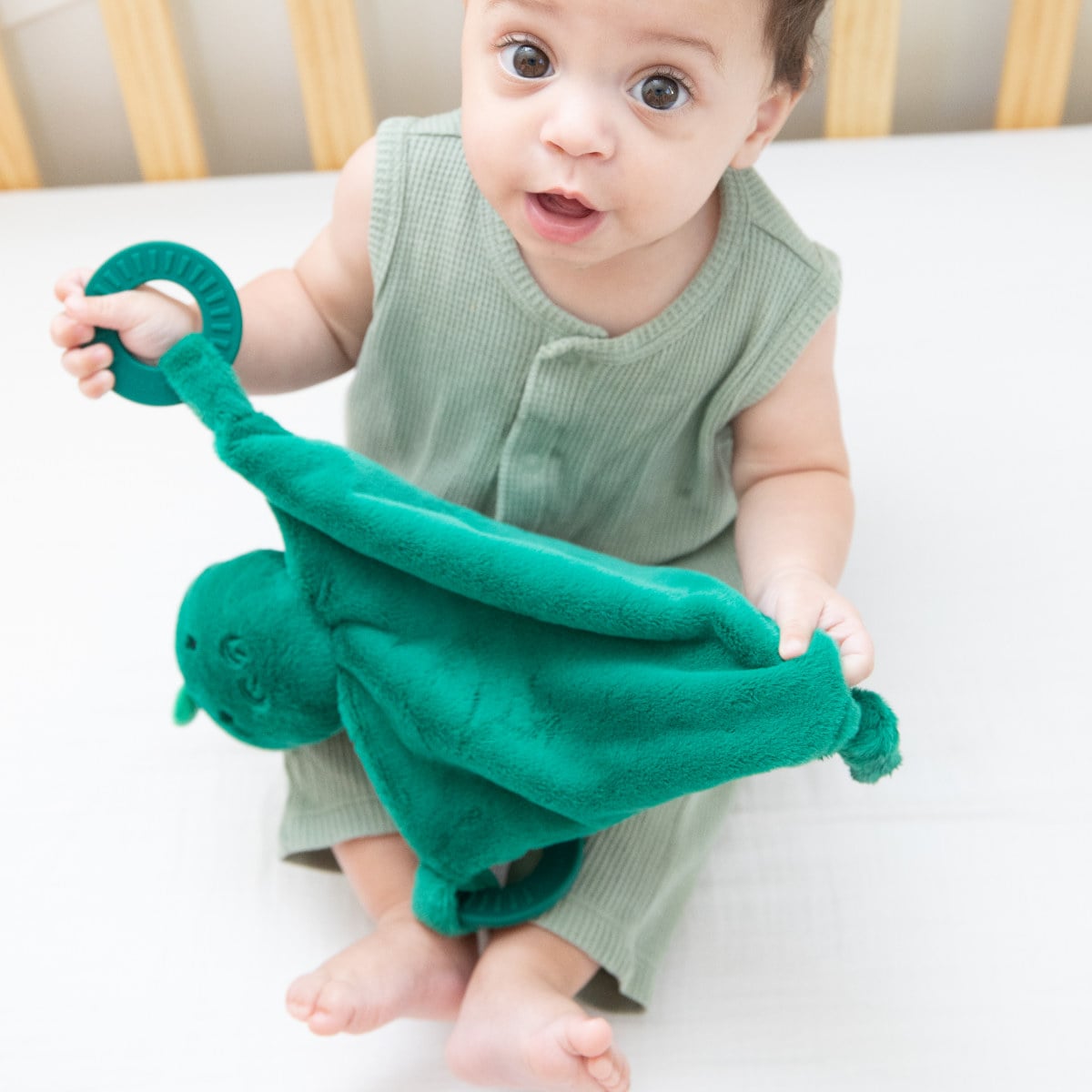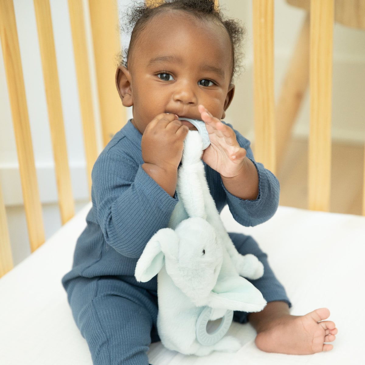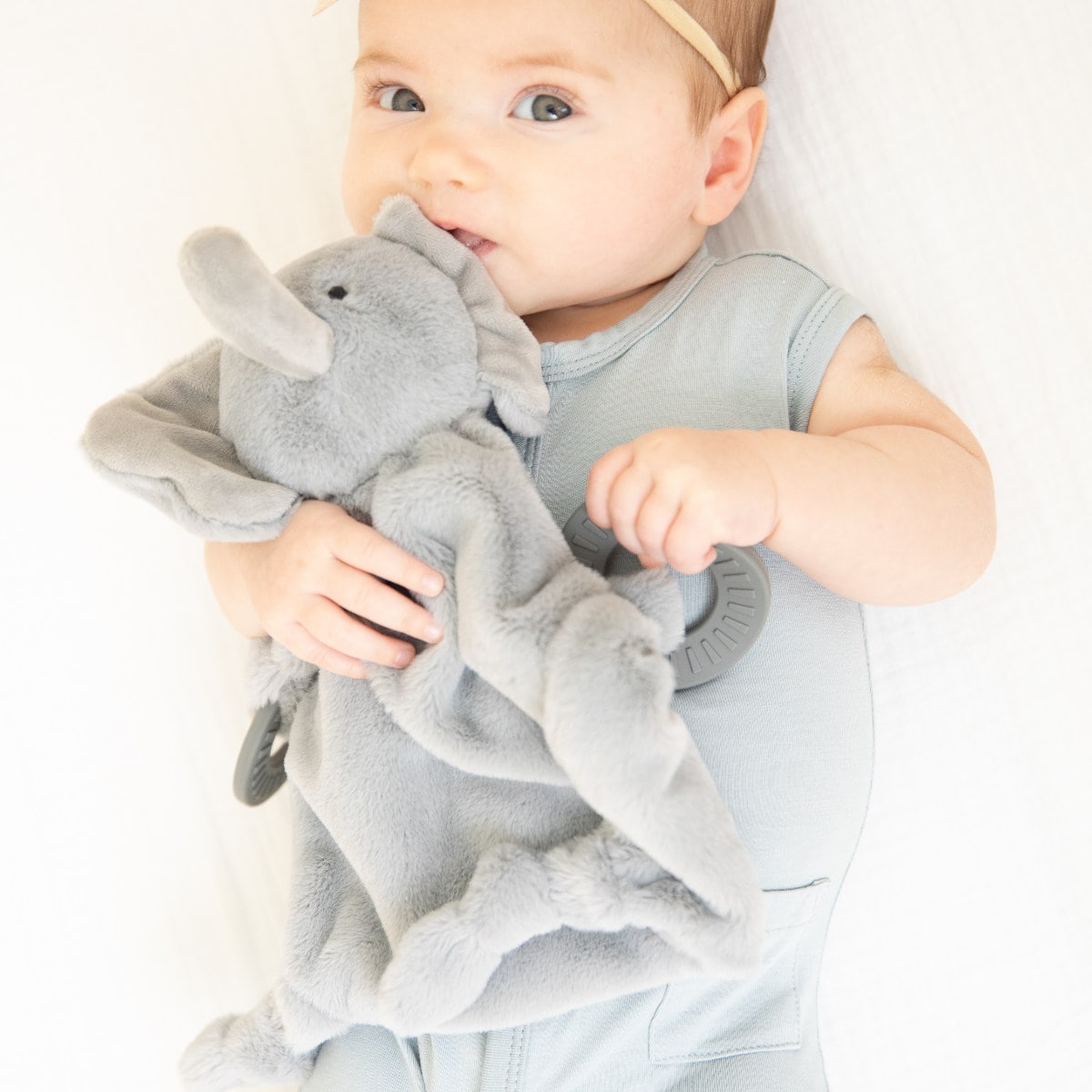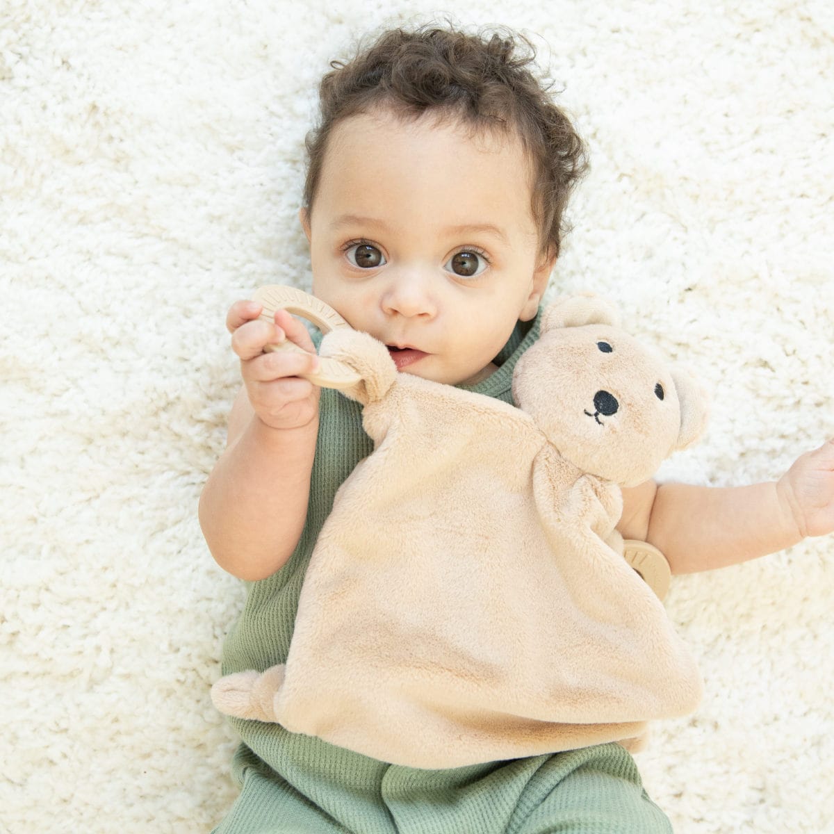 動物モチーフのぬいぐるみに歯固めとラトルが付いたティーザーバディです。子どもたちの年齢、ステージに合わせて一緒に成長し、友達であり続けるようにデザインされています。
