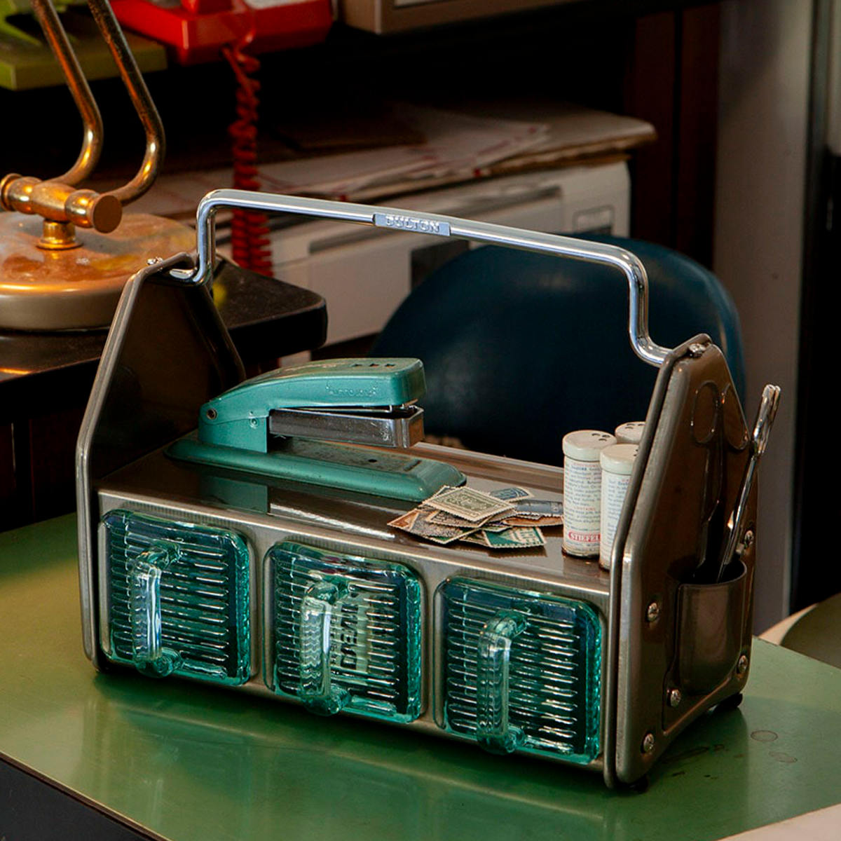 テーブルやデスクにおいて調味料や小物をまとめるのにピッタリなラックです。スチール×ガラスの組合せが無骨さとクラシカルな雰囲気を演出しています。これを置くために中に入れる小物を用意したいと思えるようなデザイン性が高いアイテムです。