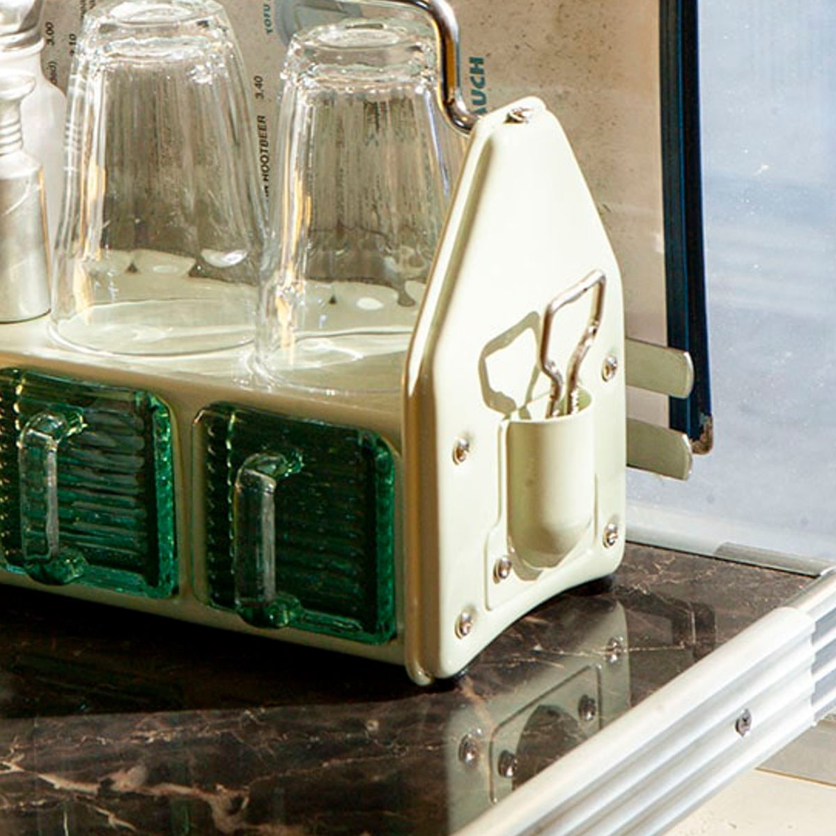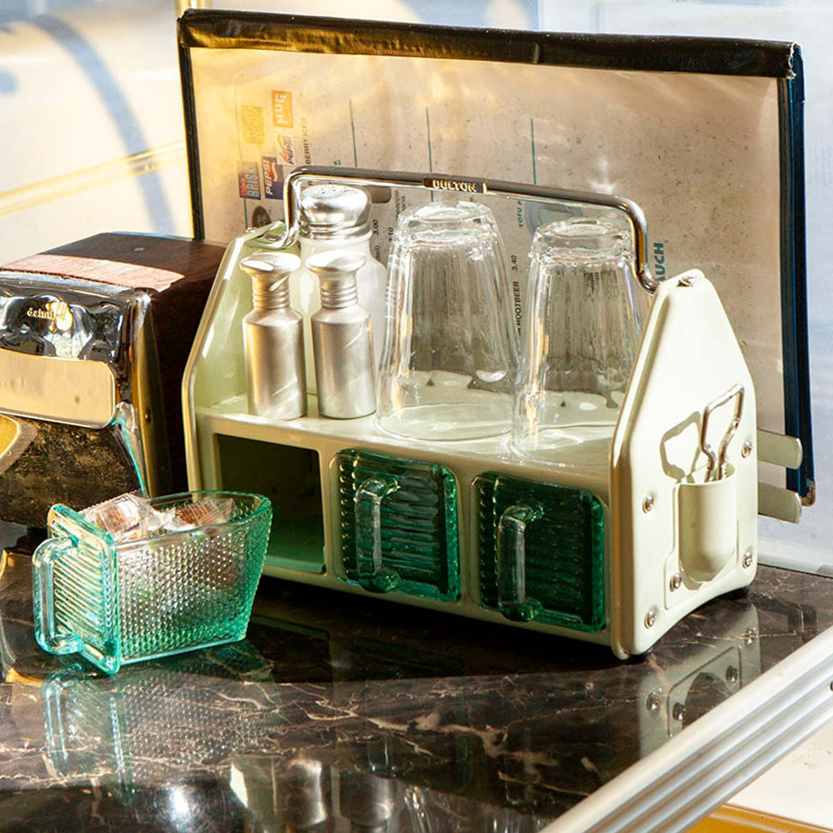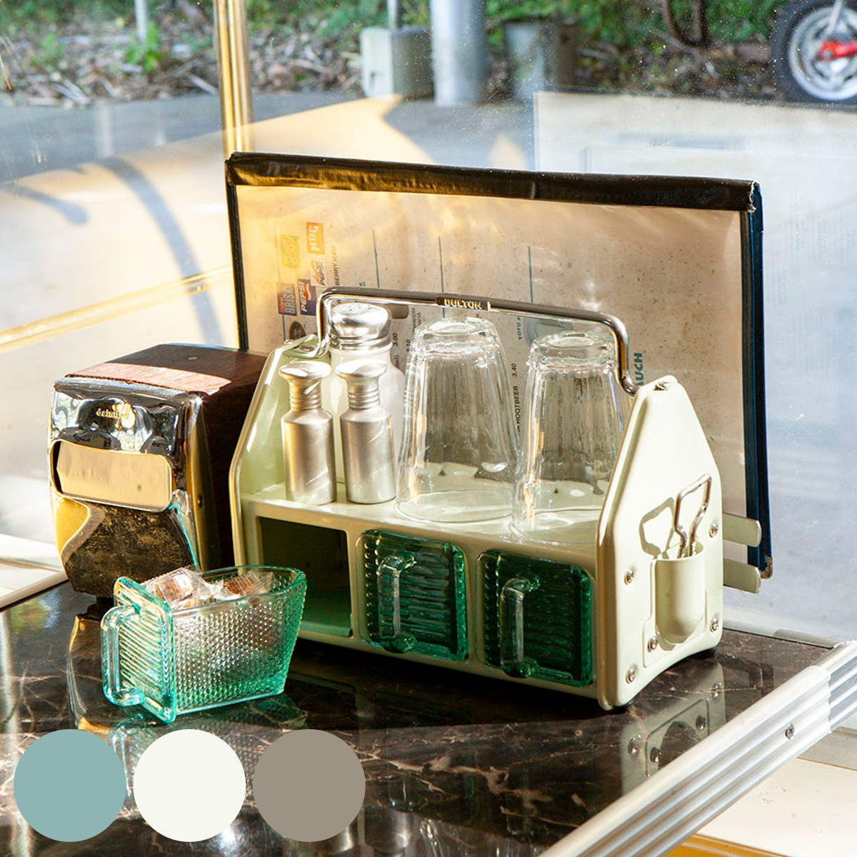 テーブルやデスクにおいて調味料や小物をまとめるのにピッタリなラックです。スチール×ガラスの組合せが無骨さとクラシカルな雰囲気を演出しています。これを置くために中に入れる小物を用意したいと思えるようなデザイン性が高いアイテムです。