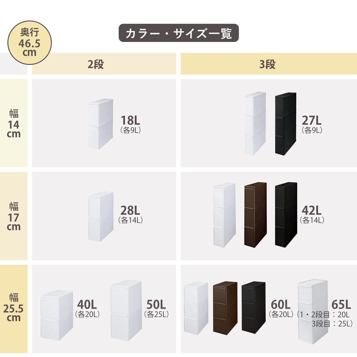 幅14・17・25.5cmの中から、設置場所に合ったサイズ・カラーをお選びいただけます。奥行が同じなので、サイズ違いの同シリーズ商品を並べて使用する事も可能です。