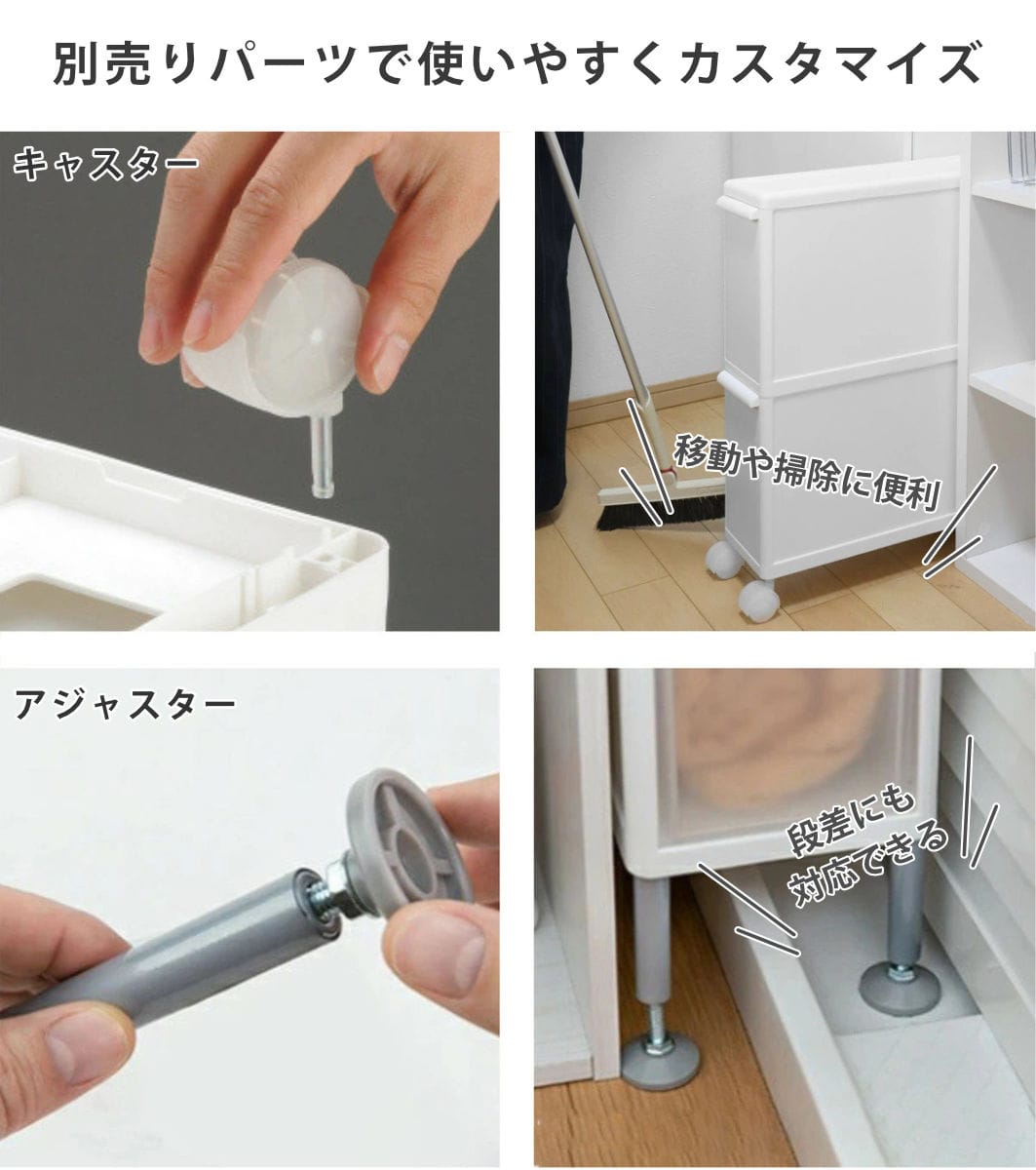 別売りでキャスターとアジャスターがございます。本体の差込穴に各パーツを差し込むだけなので、誰でも簡単に取付が可能です。