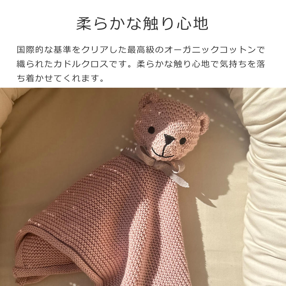 国際的な基準をクリアした最高級のオーガニックコットンで作られたカドルクロスです。肌触りが良く赤ちゃんの肌にも優しい素材を使用しています。にぎにぎしながら遊んだり、広げればお昼寝用のベビーケットにもなります。