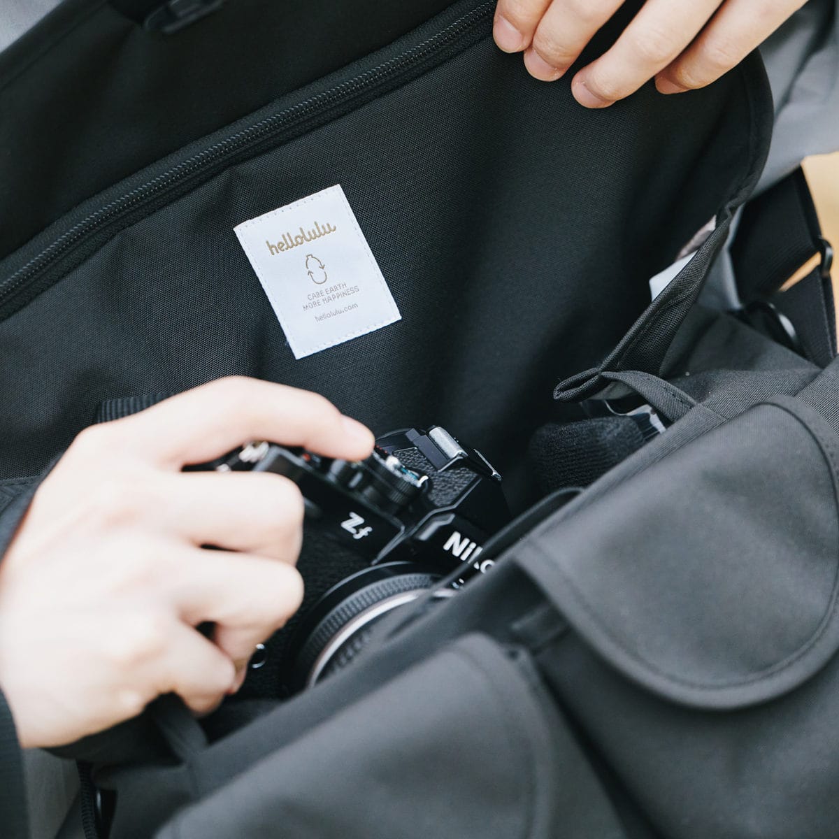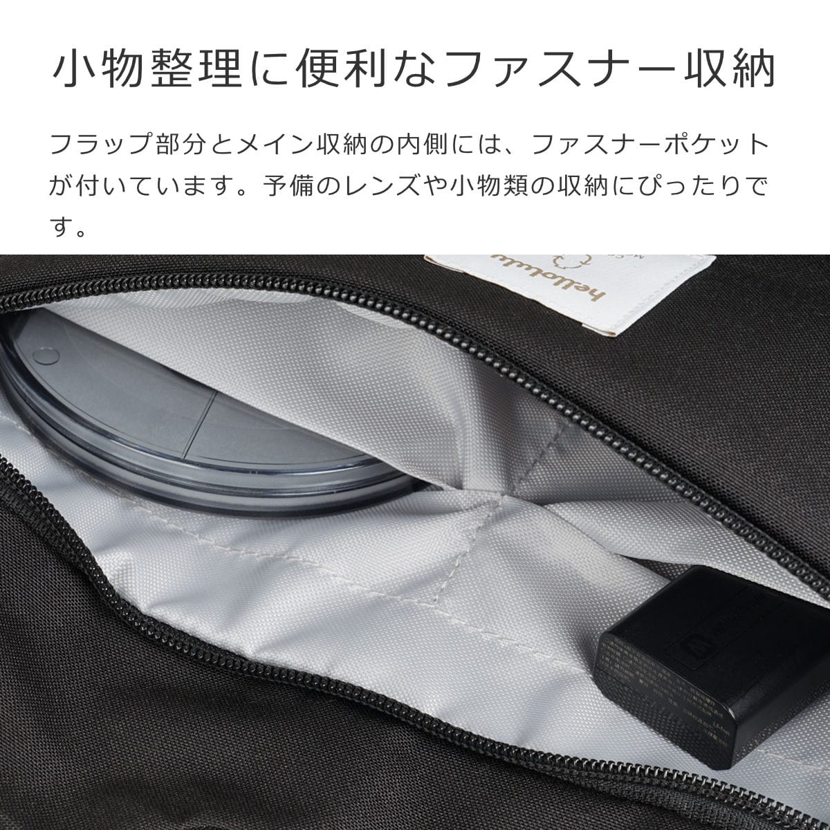 フラップ部分と内側にはファスナーポケットが付いています。予備のレンズや小物類の収納にぴったりです。